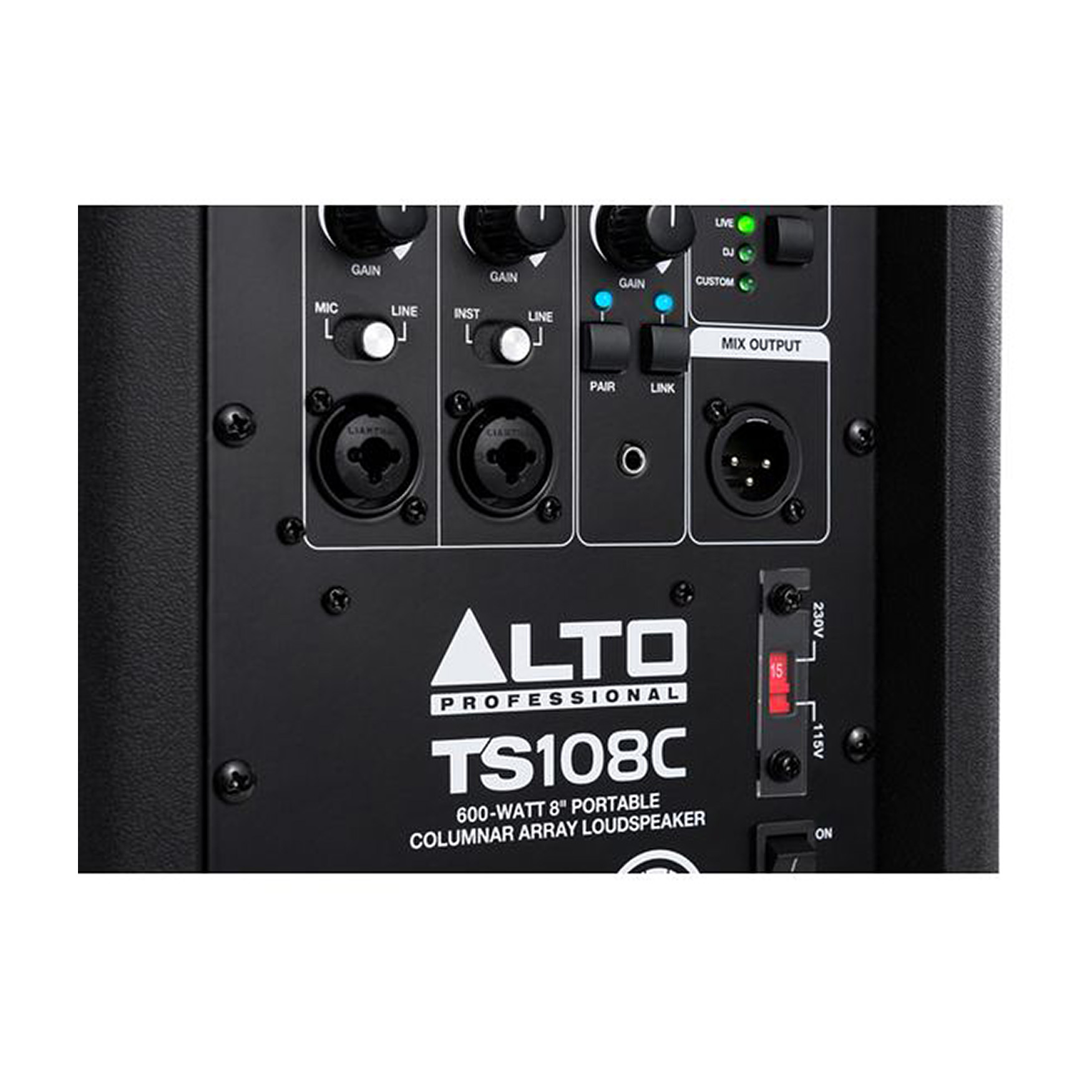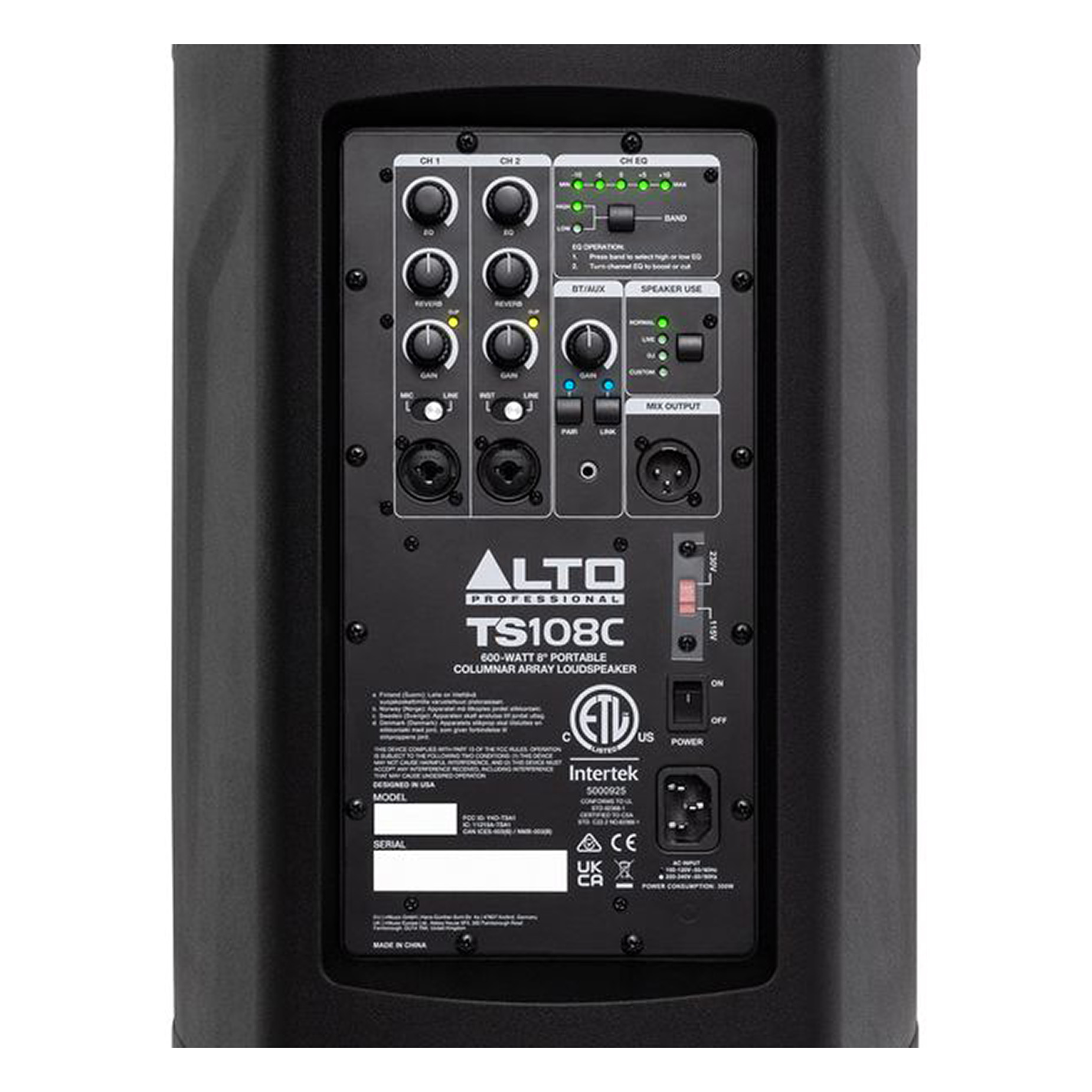 Alto Professional TS108C to kompaktowy, przenośny głośnik kolumnowy PA o mocy 600 W z wbudowanym subwooferem 8”, sześcioma głośnikami wysokotonowymi, DSP, 3-kanałowym mikserem i Bluetooth. Doskonały do koncertów, DJ-ingu i nagłośnienia na żywo.