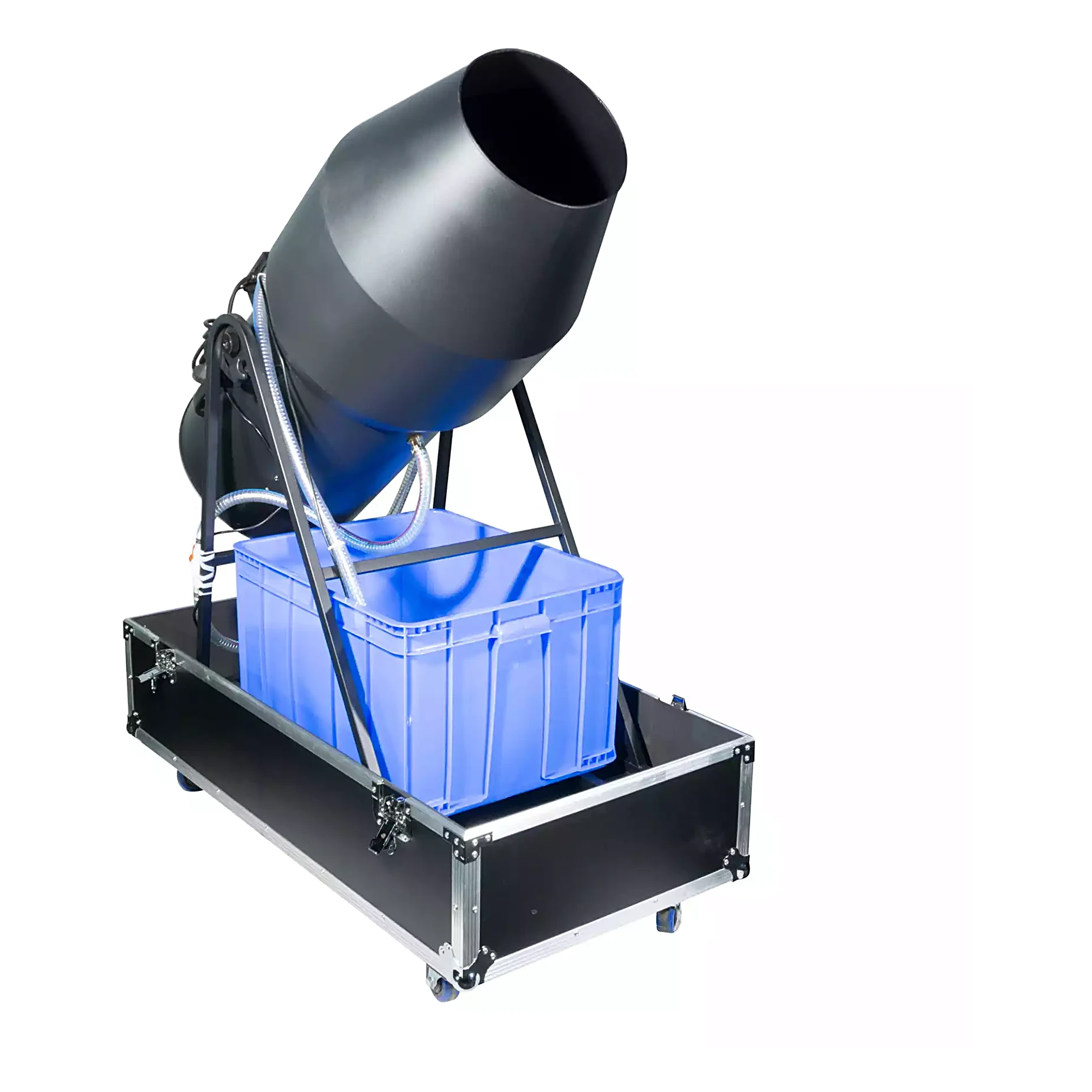 Wersja +FRAME to klucz do stabilności i łatwości obsługi. Zintegrowana, solidna rama pozwala na precyzyjną, manualną regulację kąta wyrzutu zarówno w pionie, jak i w poziomie. Możesz skierować strumień prosto w tłum lub ustawić go pod kątem, tworząc efekt "opadającego śniegu" z piany. Całość osadzona jest w dedykowanej skrzyni transportowej (case) na kółkach, co sprawia, że mimo swojej mocy i wagi, jest to rozwiązanie w pełni mobilne.