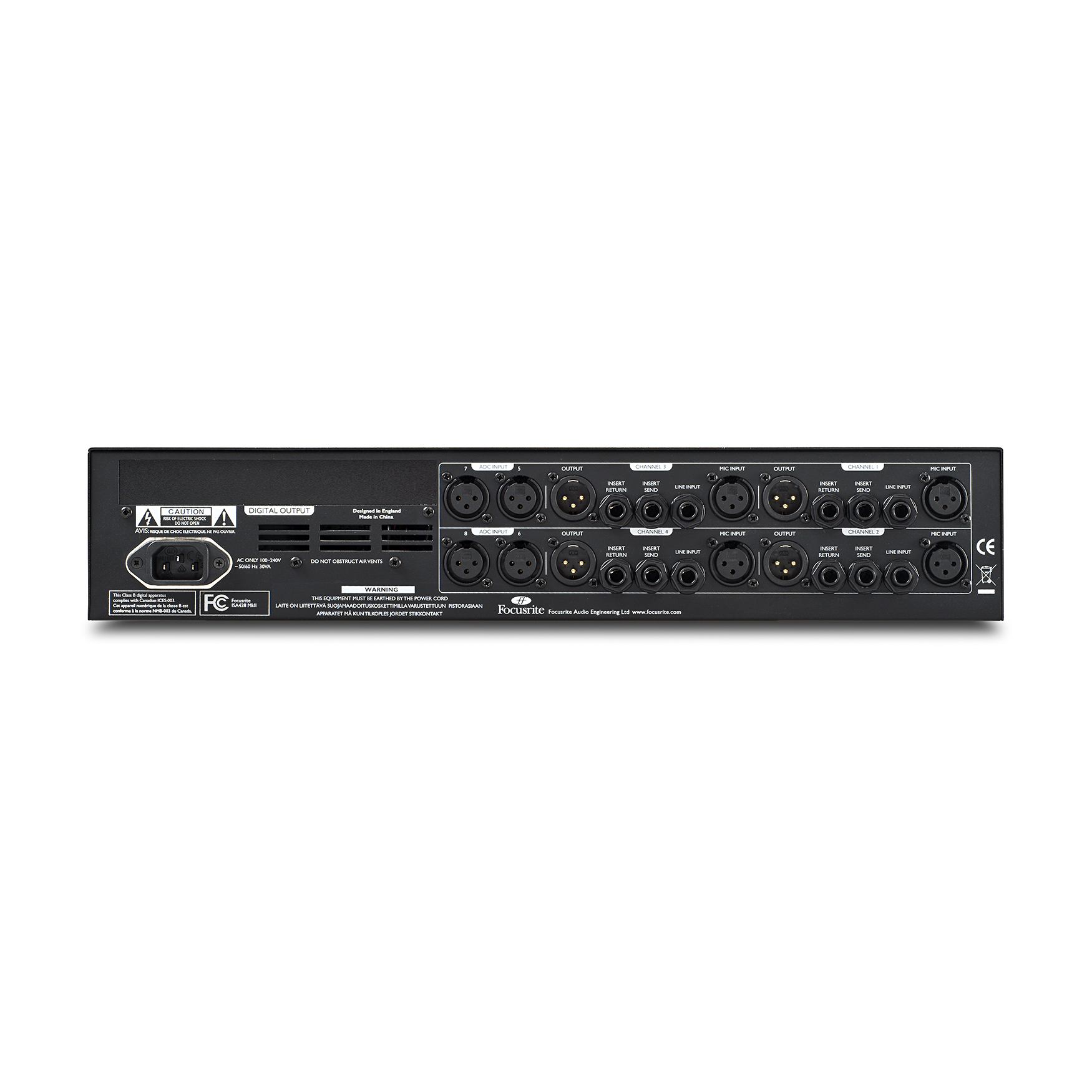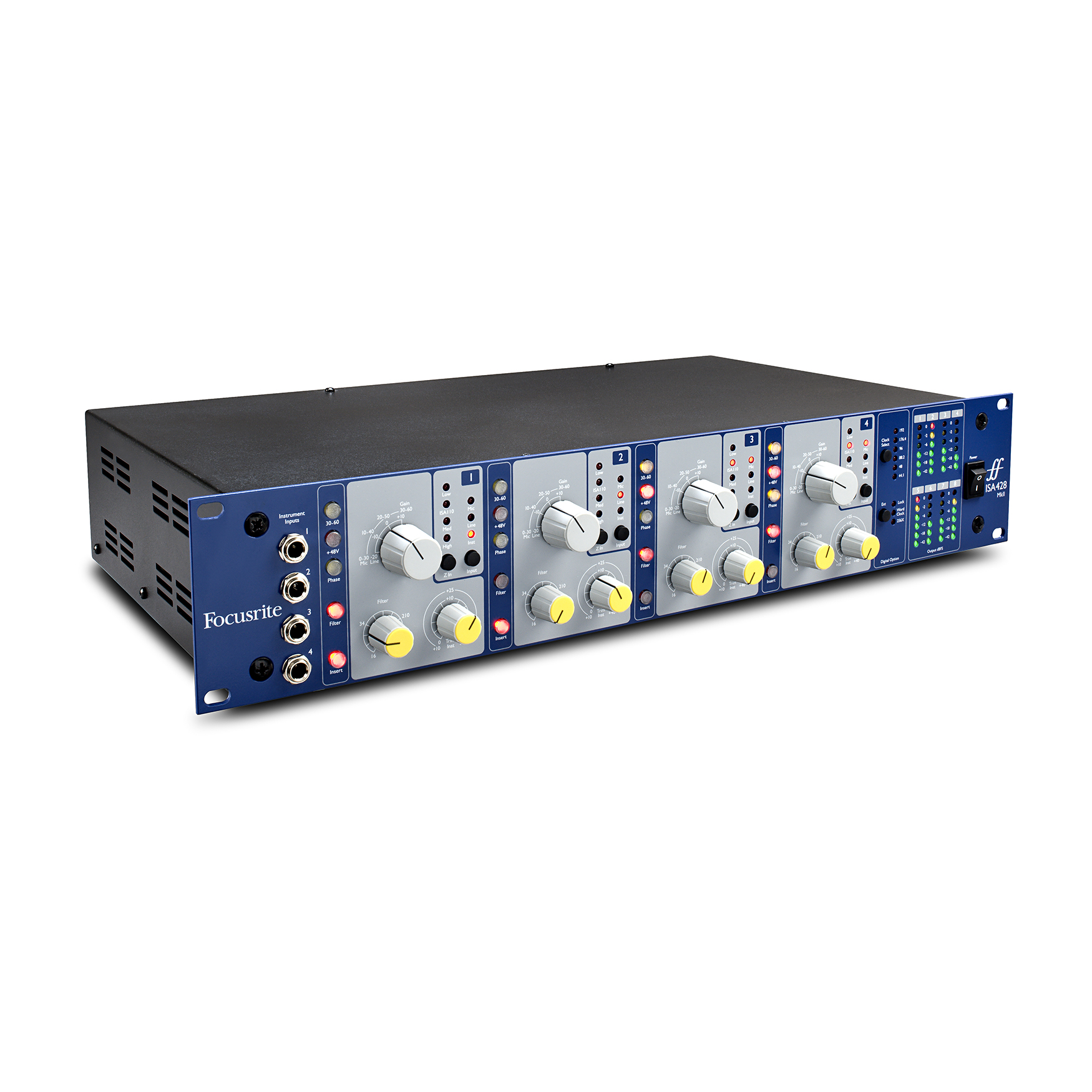 Focusrite ISA 428 MKII. Wysokiej klasy poczwórny przedwzmacniacz mikrofonowy wyposażony w poszukiwane, klasyczne, transformatorowe układy preampów znane ze stołów NEVE. Przełączana impedancja wejściowa, alternatywne wejścia instrumentalne. Każdy kanał wyposażony w punkt insertowy i układ "Soft Limitera". Precyzyjne wskaźniki wysterownania VU oraz diodowe Peak. Pasmo przenoszenia 10Hz - 200kHz. Opcja wyjścia cyfrowego AES/EBU, SPDiF w formacie 24 bity/192 kHz (gniazda typu "D") i TOSLINK 96kHz.