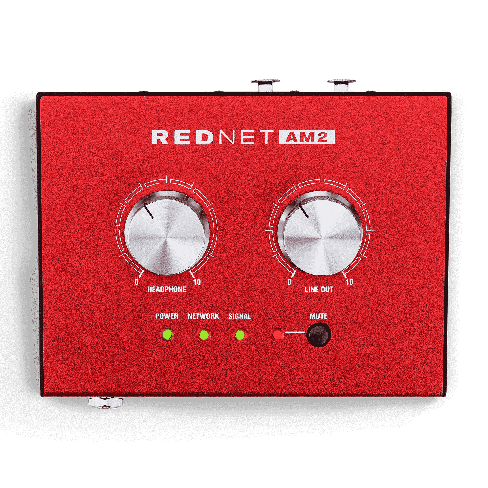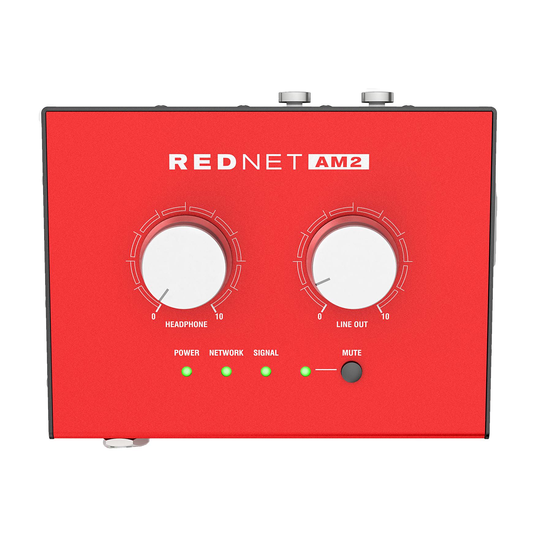 Focusrite RedNet AM2 zawiera 2-kanałowy odbiornik Dante oparty na sprzęcie Audinate "Ultimo" i zawiera wysokiej jakości konwersję cyfrowo-analogową przy standardowych częstotliwościach próbkowania od 44,1 do 96 kHz do monitorowania dźwięku w sieci stereo za pośrednictwem wyjść liniowych - na przykład do użytku z głośnikami - lub słuchawek, przy czym oba wyjścia oferują większy niż 118 dB zakres dynamiki). Urządzenie może być taktowane wewnętrznie lub przez sieć Dante Master. Dwa duże pokrętła regulacji głośności są dostępne dla poziomów wyjścia słuchawkowego i liniowego, przy czym to drugie jest wyposażone w przycisk wyciszenia z powiązaną diodą LED.Inne wskaźniki pokazują obecność zasilania, sieci i sygnału. Wskaźnik sygnału świeci na czerwono przy 0dBFS, pomarańczowo przy -6dBFS i zielono przy -42dBFS na każdym kanale, podczas gdy wskaźnik sieci świeci, gdy na porcie 1 lub 2 obecne jest prawidłowe połączenie sieciowe.Zasilanie przez Ethernet lub zewnętrzny zasilacz