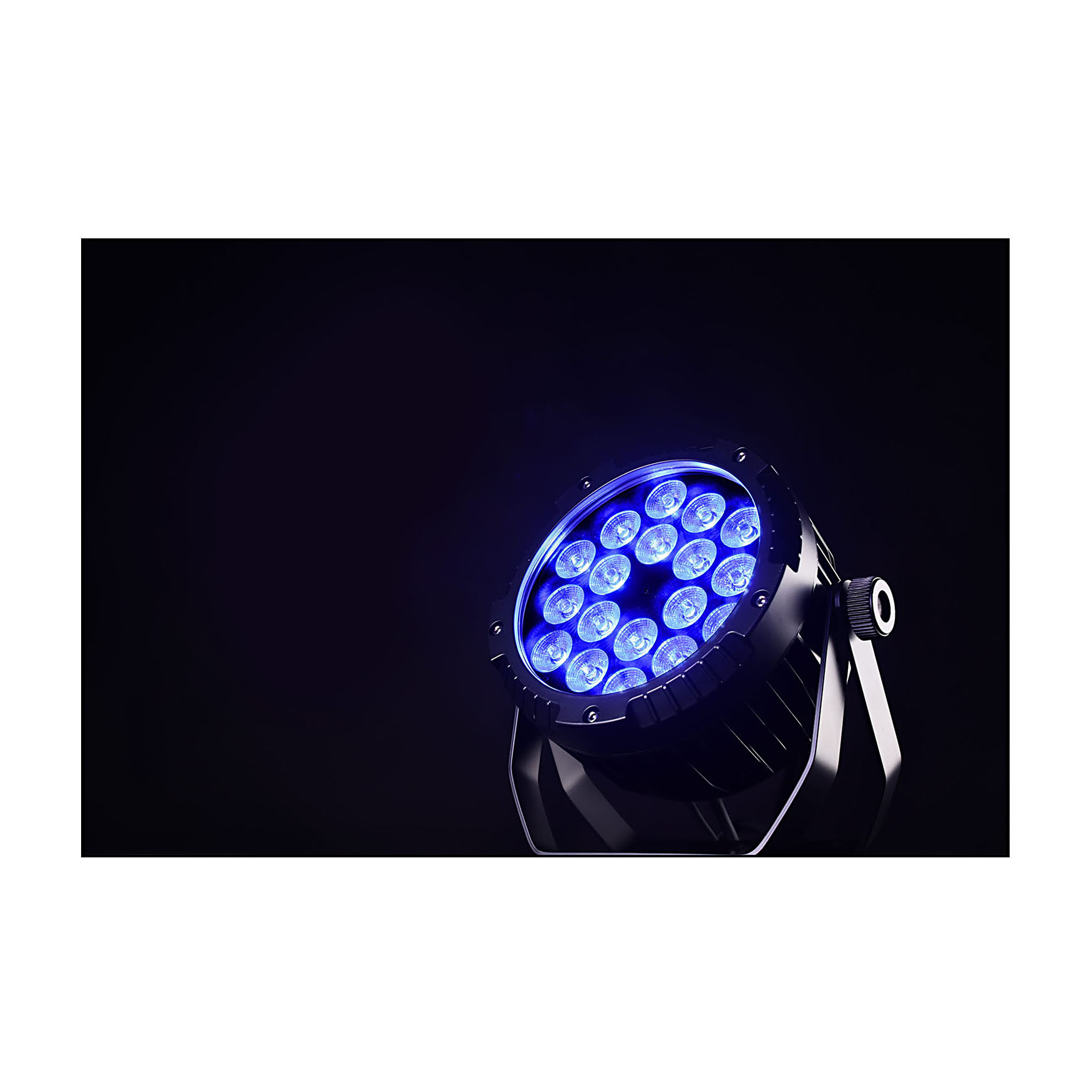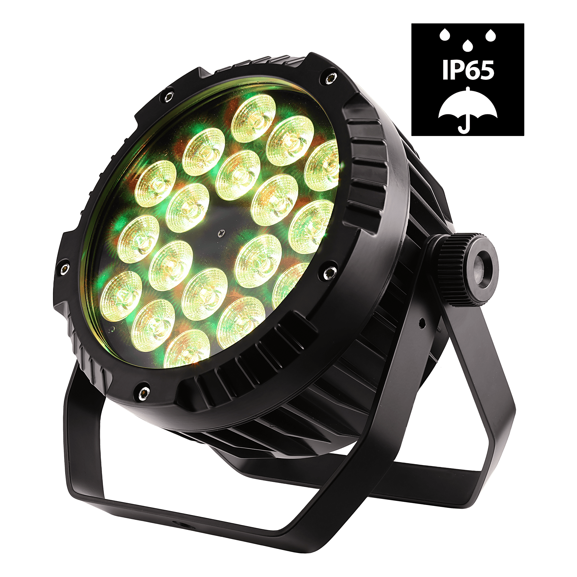 Wytrzymały LED Par IP65 z 18x15W RGBWA 5w1. Mocne światło, odporność na warunki atmosferyczne i świetna cena — idealny dla firm eventowych i sal weselnych.