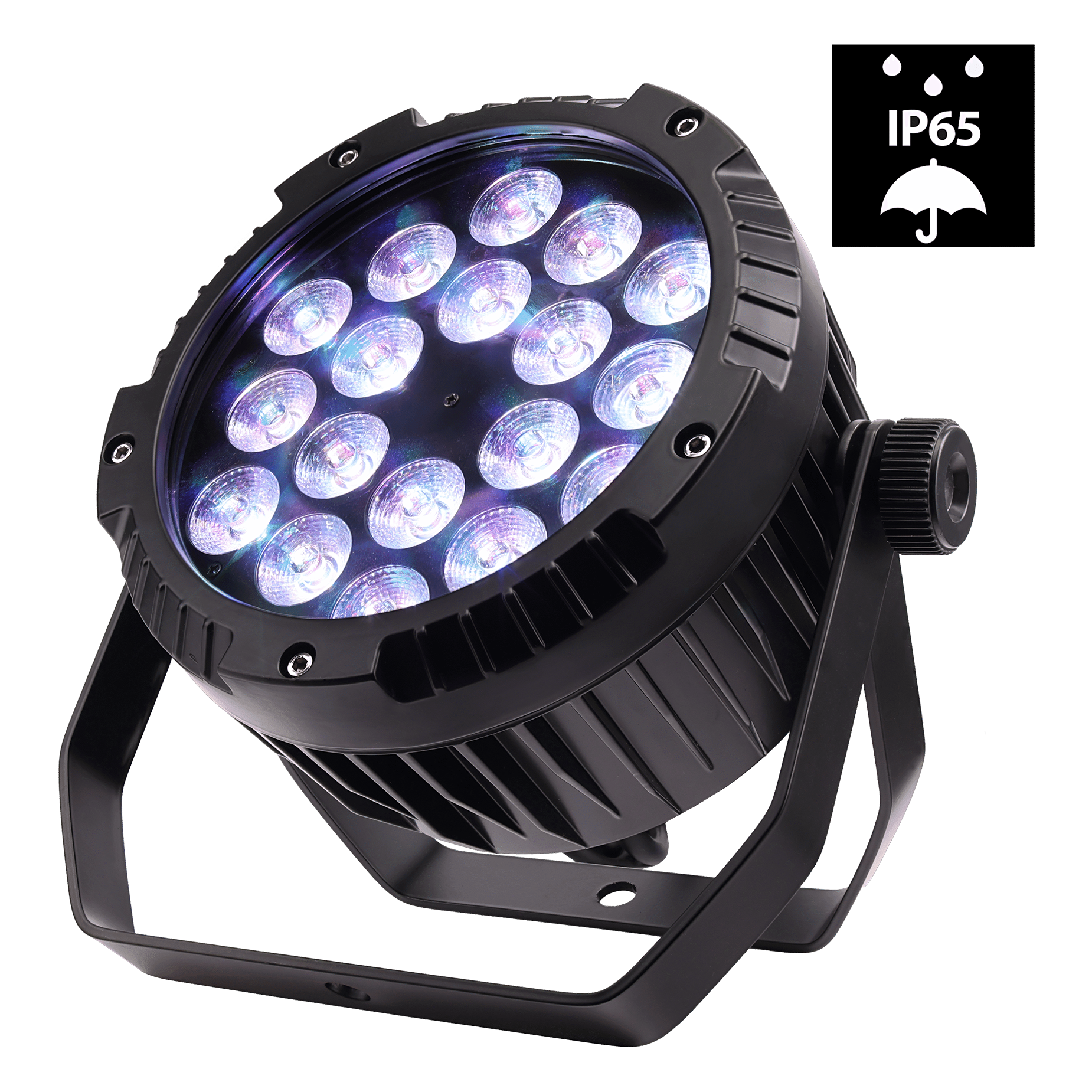 OPTIRAY 18x18W IP65 – mocny Par LED RGBWA+UV do zastosowań indoor i outdoor. Odporność IP65, intensywne kolory i efekt UV idealne na eventy.