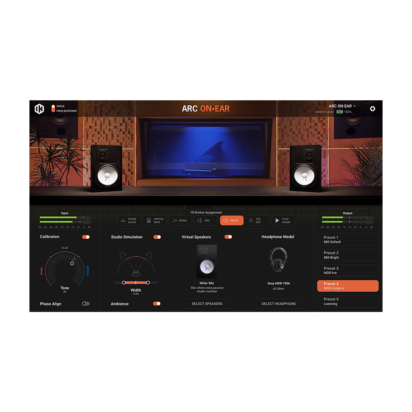 ARC ON•EAR nie korzysta z wirtualnych pomieszczeń opartych na impulsach. Zamiast tego stosuje zaawansowane modelowanie fizyczne, aby odtworzyć zachowanie prawdziwych monitorów studyjnych w idealnej przestrzeni akustycznej. Żadnych sztucznych pogłosów, żadnych podbarwień – tylko naturalna głębia, szerokość i klarowność profesjonalnego studia, prosto w Twoich słuchawkach.