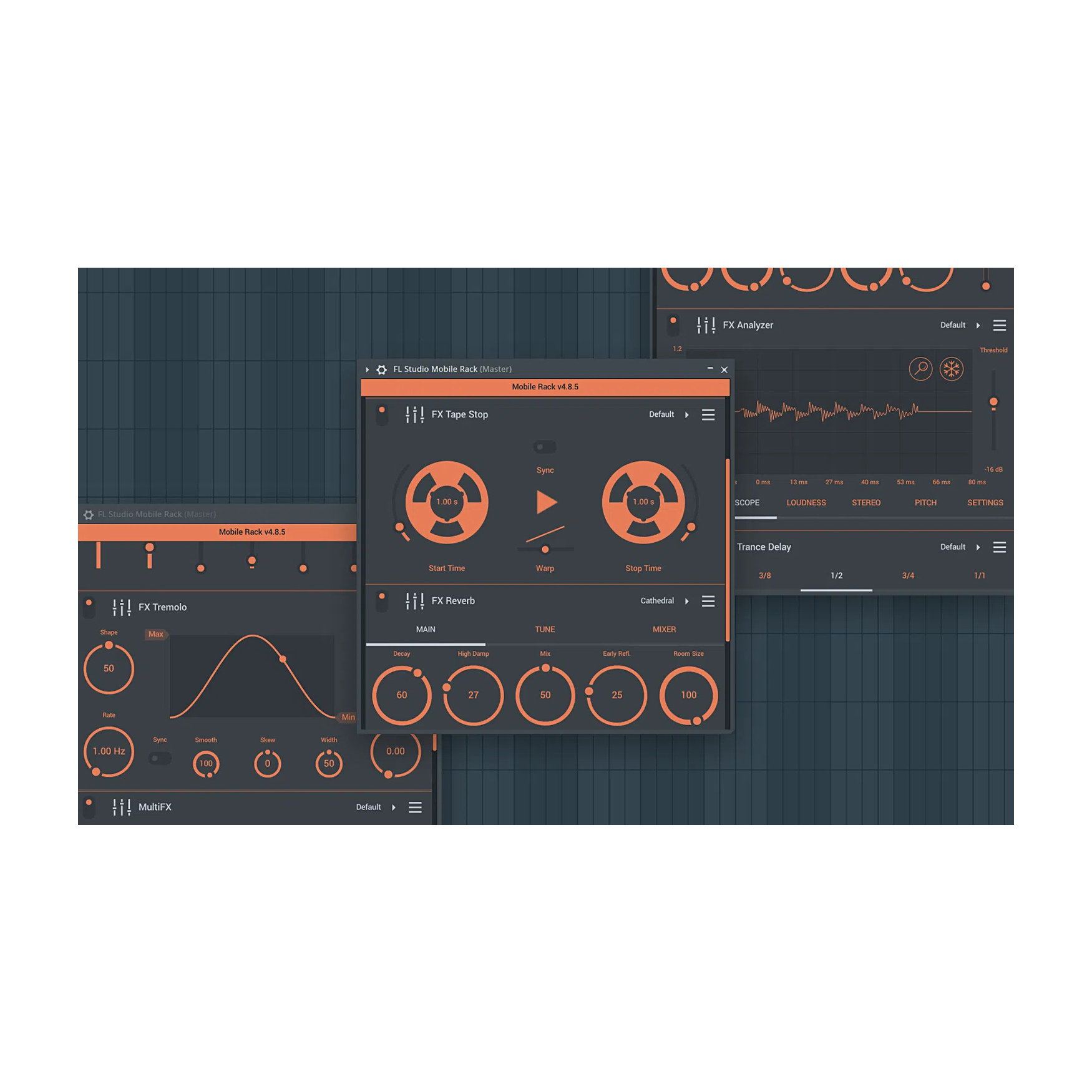 Uzyskaj dostęp do 7 instrumentów i 29 efektów z FL Studio Mobile, w tym Minisynth, Wow & Flutter oraz Tape Stop. Używaj ich samodzielnie lub w kombinacjach. Niskie obciążenie procesora, doskonała jakość dźwięku, dostępne we wszystkich wersjach.