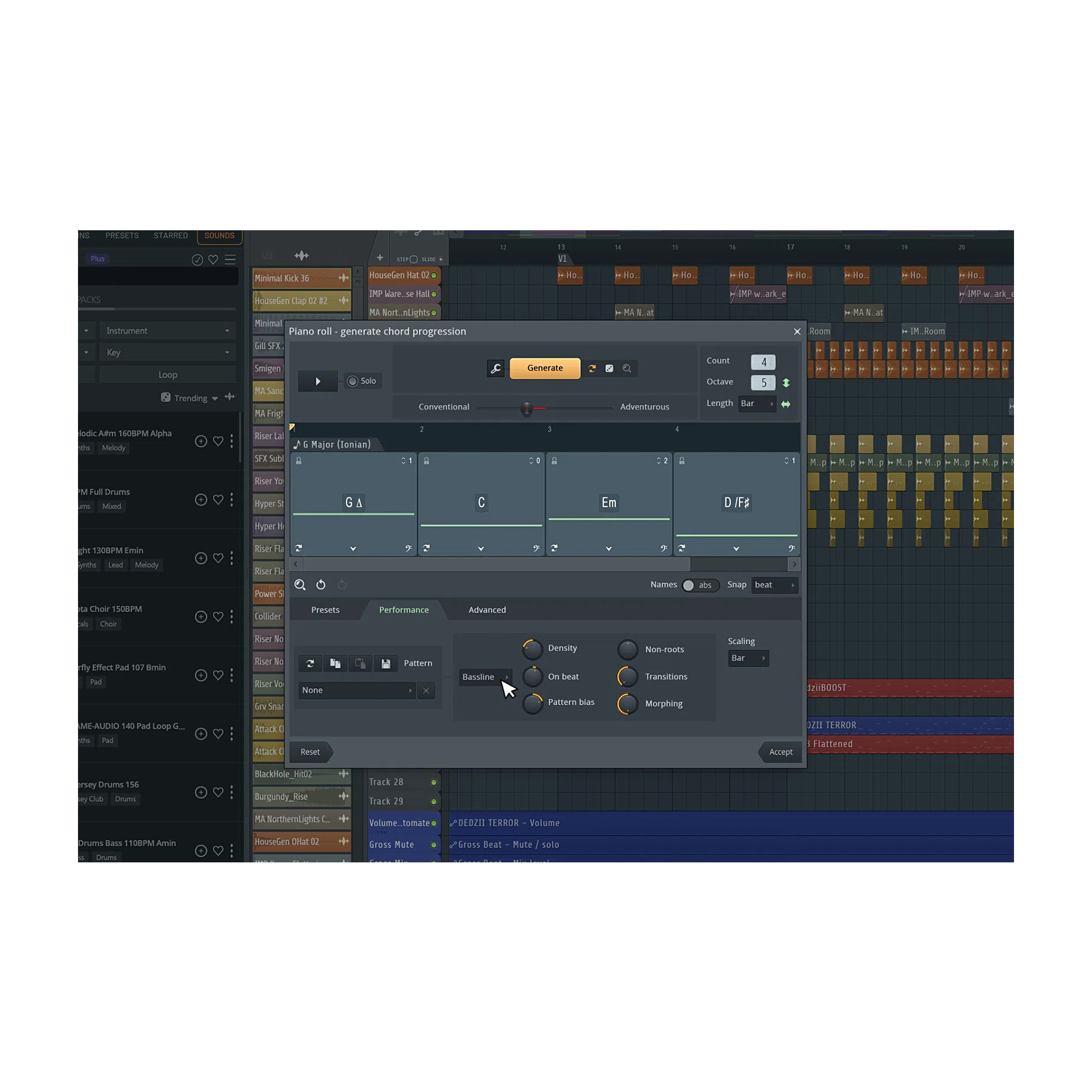 Nowy tryb linii basowych w narzędziu Chord Progression Tool zapewnia natychmiastowe groove'y basowe, które można połączyć z dowolną progresją, i pozwala rozwijać pomysły.