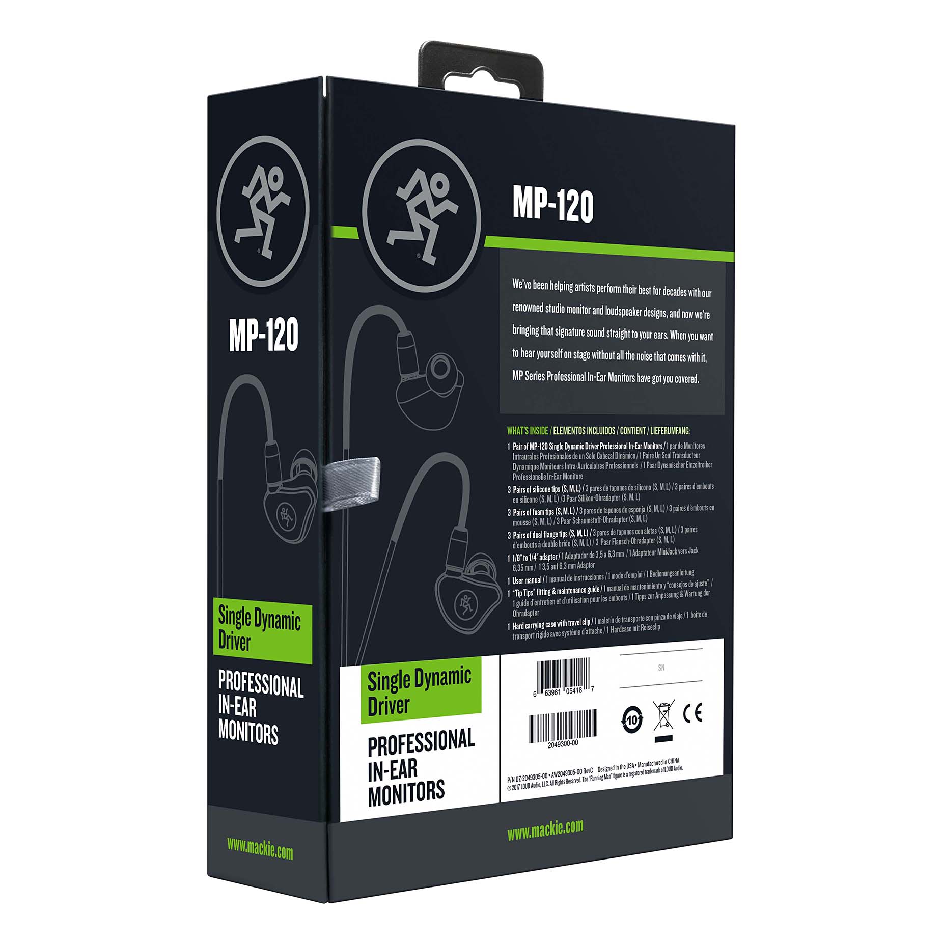 Mackie MP-120 to profesjonalne słuchawki douszne wyposażone w jeden duży przetwornik dynamiczny. Jest to wysokiej jakości komponent wybrany ze względu na zdolność dostarczenia dużej ilości basu bez rezygnacji z wysokiej częstotliwości artykulacji i detali wokalnych. Model ten oferuje zrównoważony dźwięk, który doskonale sprawdza się w całym spektrum.