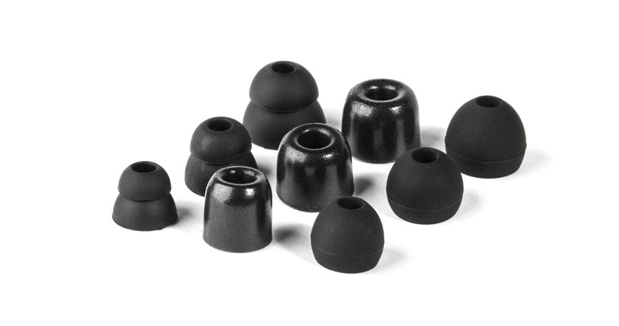 - W zestawie znajdują się końcówki piankowe, silikonowe i z podwójnym kołnierzem w małych, średnich i dużych rozmiarach.