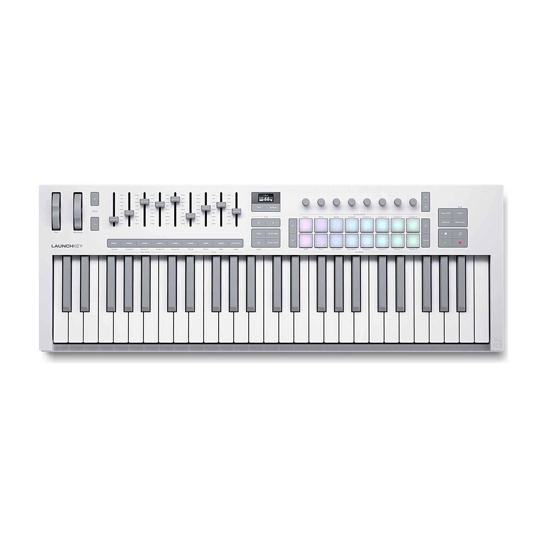 Launchkey 49 White daje Ci pełną kontrolę nad DAW. Wbudowany arpeggiator, tryby akordów i niestandardowe mapowania elementów sterujących pozwalają kształtować brzmienie, balansować miks i tworzyć bez ograniczeń. Dzięki intuicyjnej integracji z DAW możesz od razu skupić się na muzyce, a nie na menu i ustawieniach.