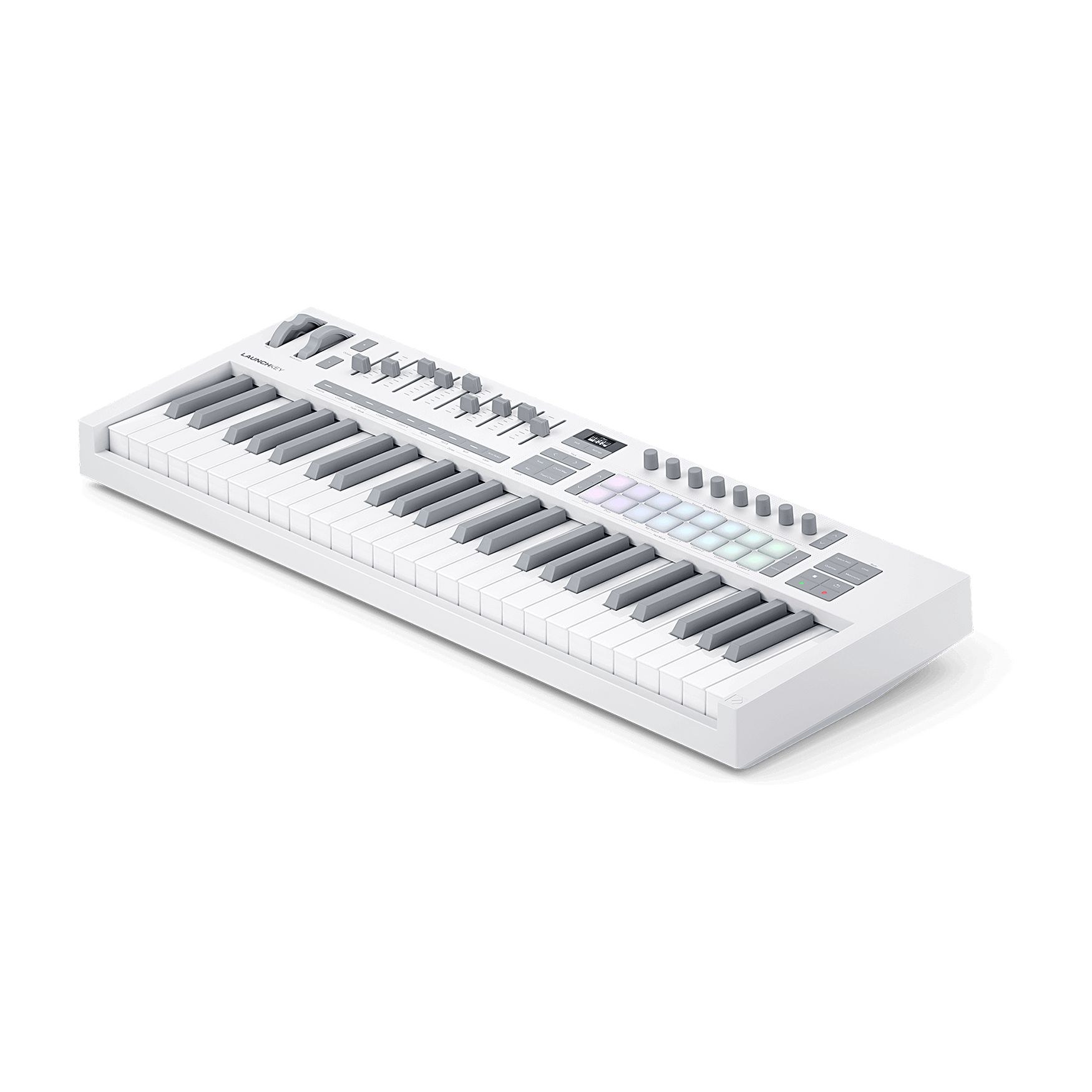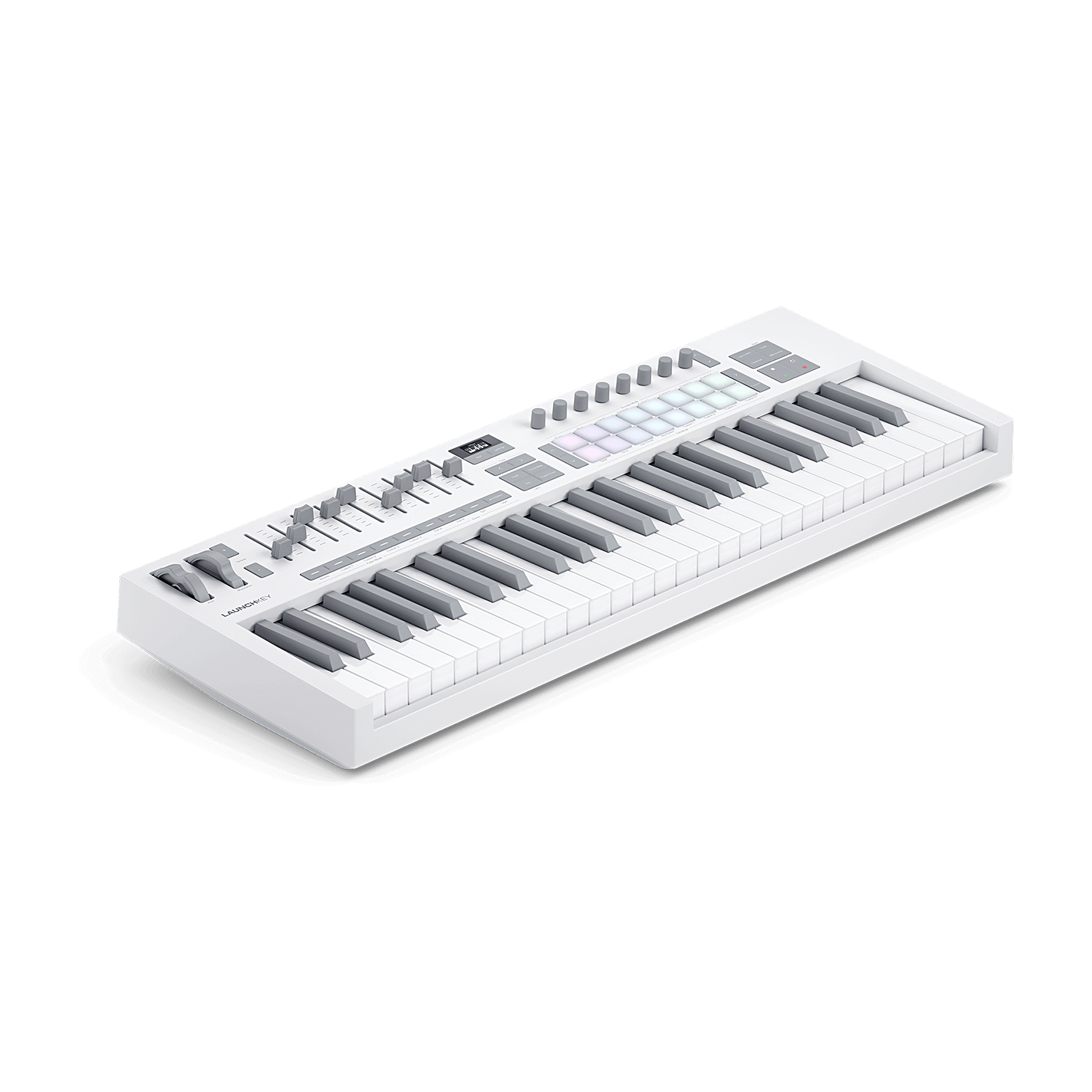 Launchkey 49 White łączy elegancki, nowoczesny wygląd z pełną funkcjonalnością kontrolera DAW. Półważone klawisze w stylu wodospadu w kolorze biało-szarym, osiem enkoderów, dziewięć faderów i 16 dynamicznych padów pozwalają na wygodną grę, uruchamianie klipów i kontrolę perkusji. Tryby Akordów i Skali współpracujące z wyświetlaczem OLED pomagają utrzymać tonację i realizować pomysły w czasie rzeczywistym.