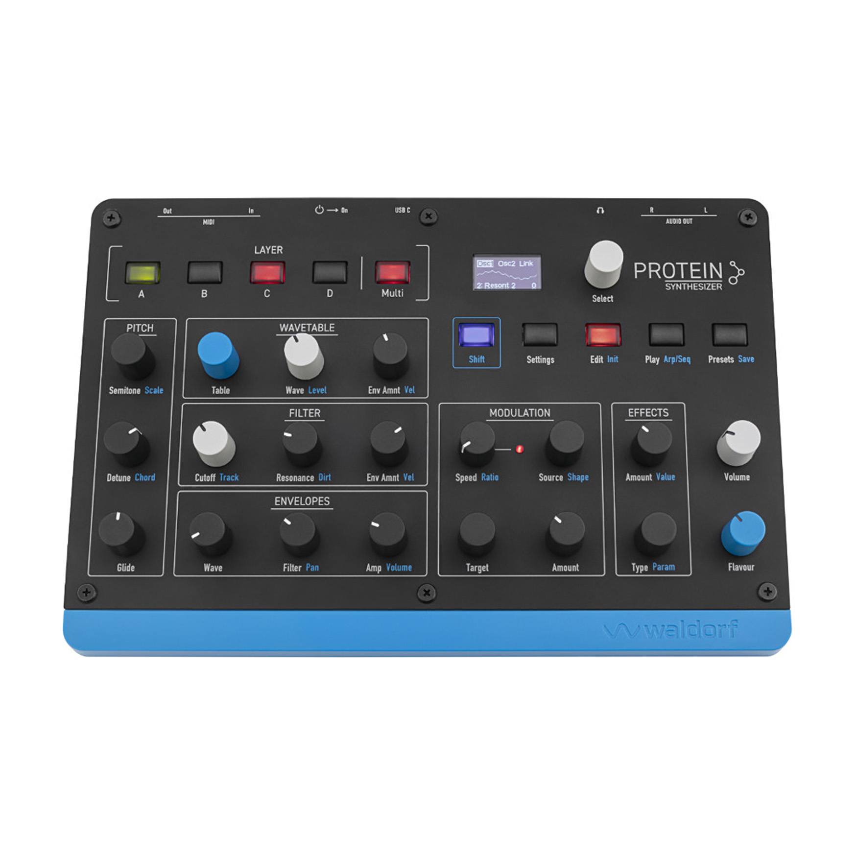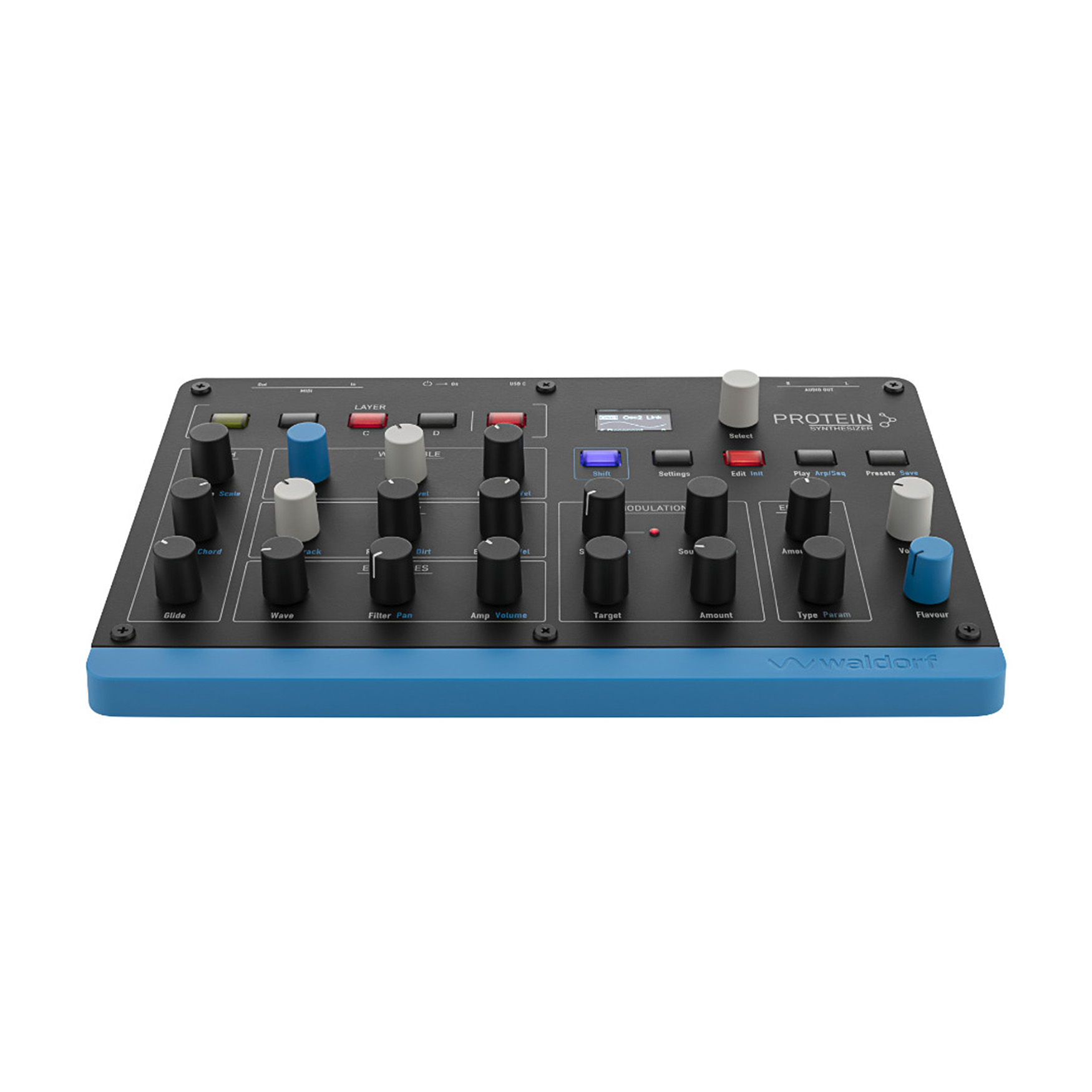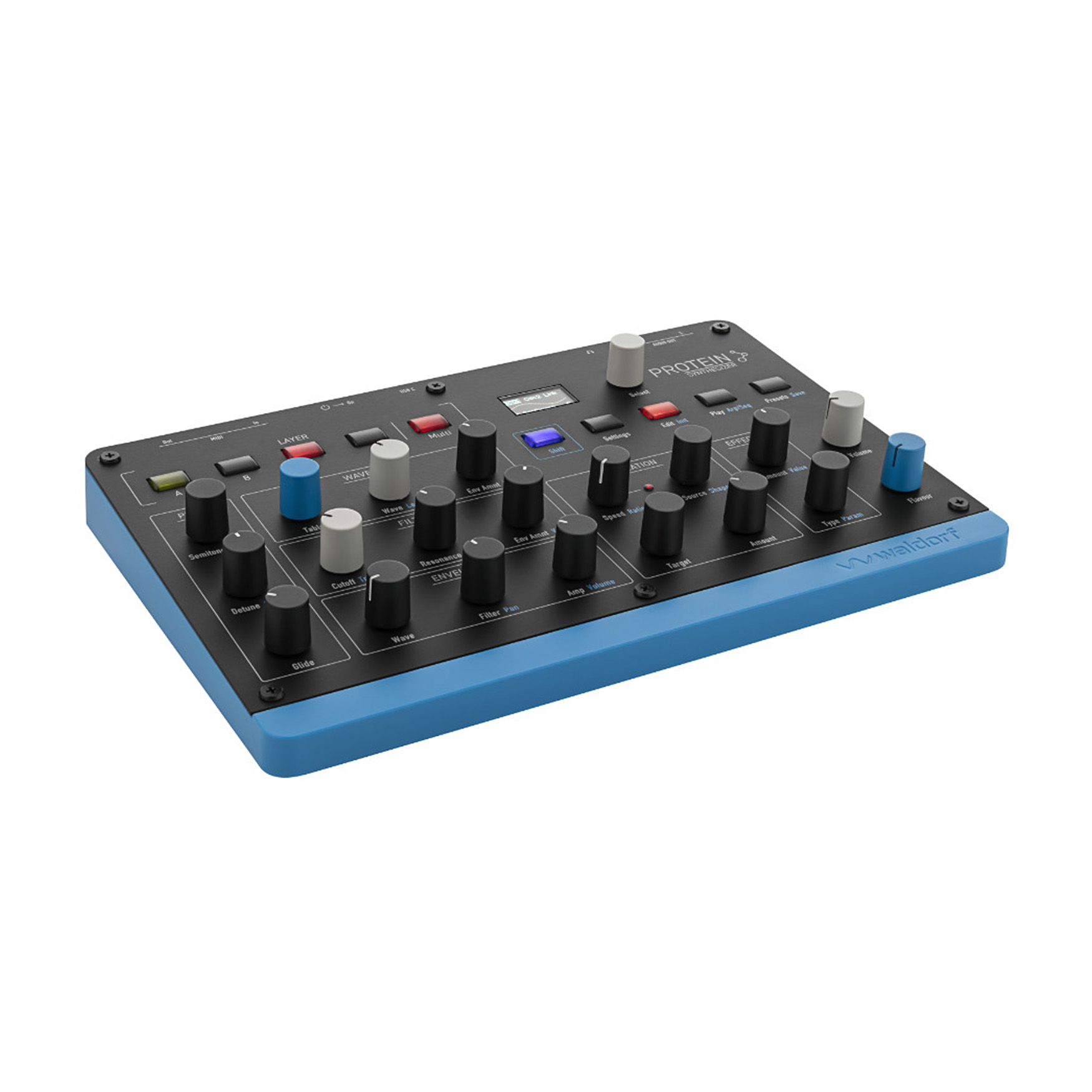 Waldorf Protein to kompaktowy, 8-głosowy syntezator Wavetable z oscylatorami Microwave 1 ASIC, zaawansowanym arpeggiatorem, sekwencerem krokowym, trybem akordowym i efektami, idealny do tworzenia nowoczesnych, wielowarstwowych brzmień w studiu i na scenie.