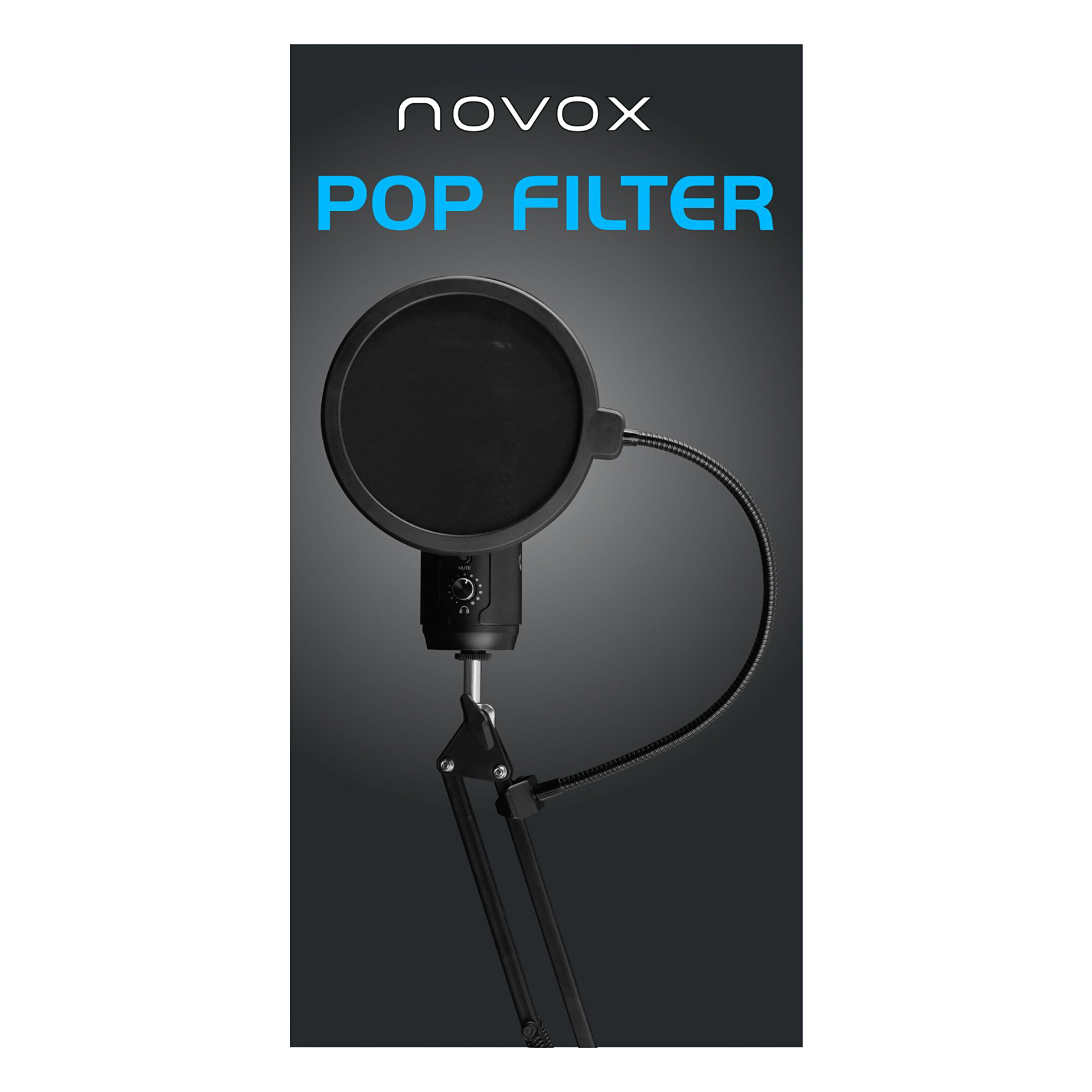 Novox Pop Filtr to metalowa osłona na mikrofon, składająca się z gęsiej szyjki, która ochrania nagrania przed zniekształceniami dźwięku.