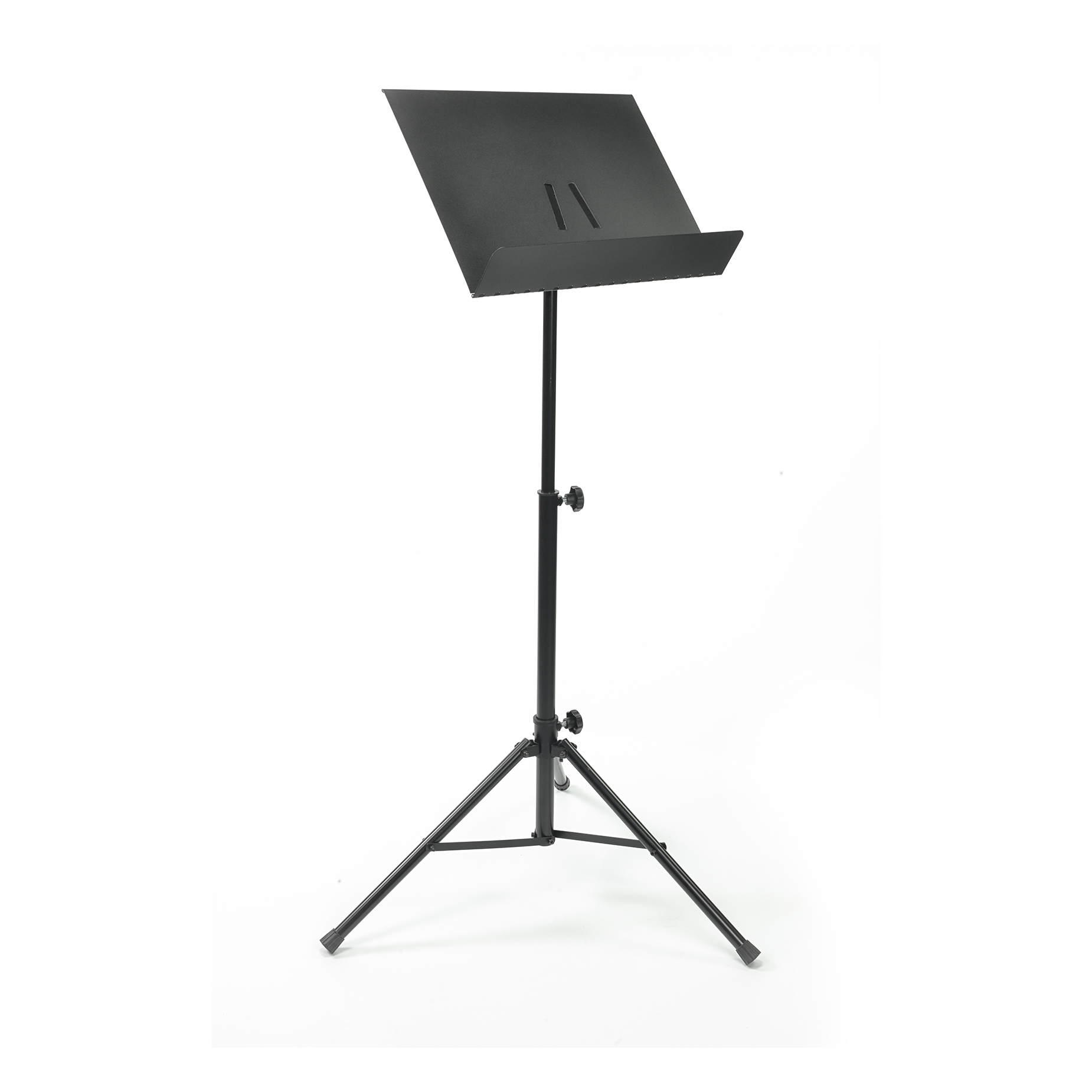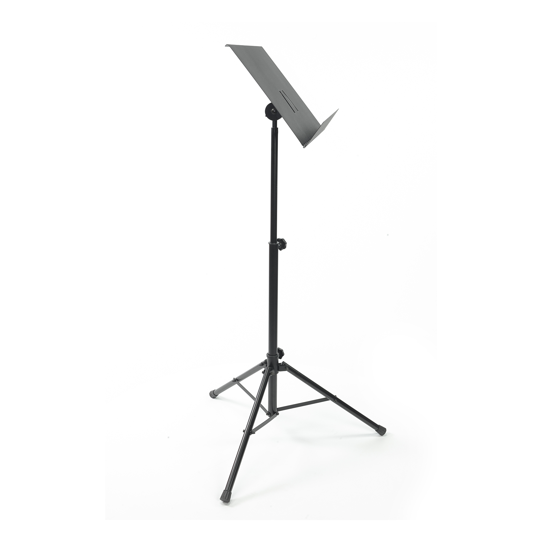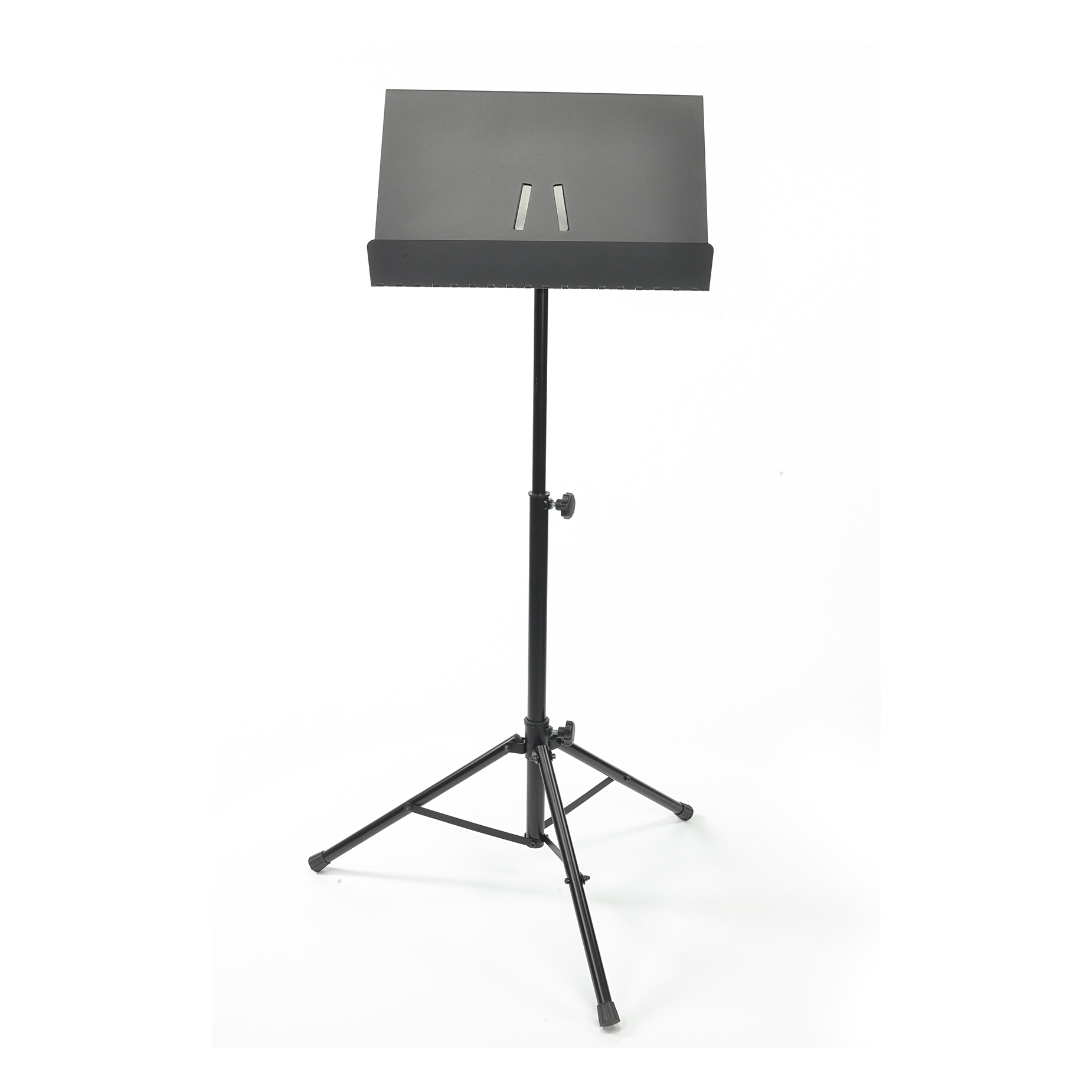 Wysokiej jakości, profesjonalny statyw do nut na metalowym trójnogu z płynną regulacją wysokości i składanym stalowym pulpitem.