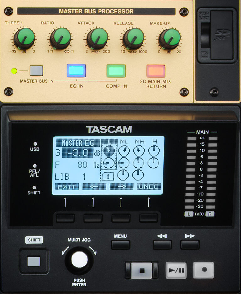 - Procesor efektów Tascam z 16 efektami jakości studyjnej (reverb, delay, chorus itp.) sterowane tłumikiem
