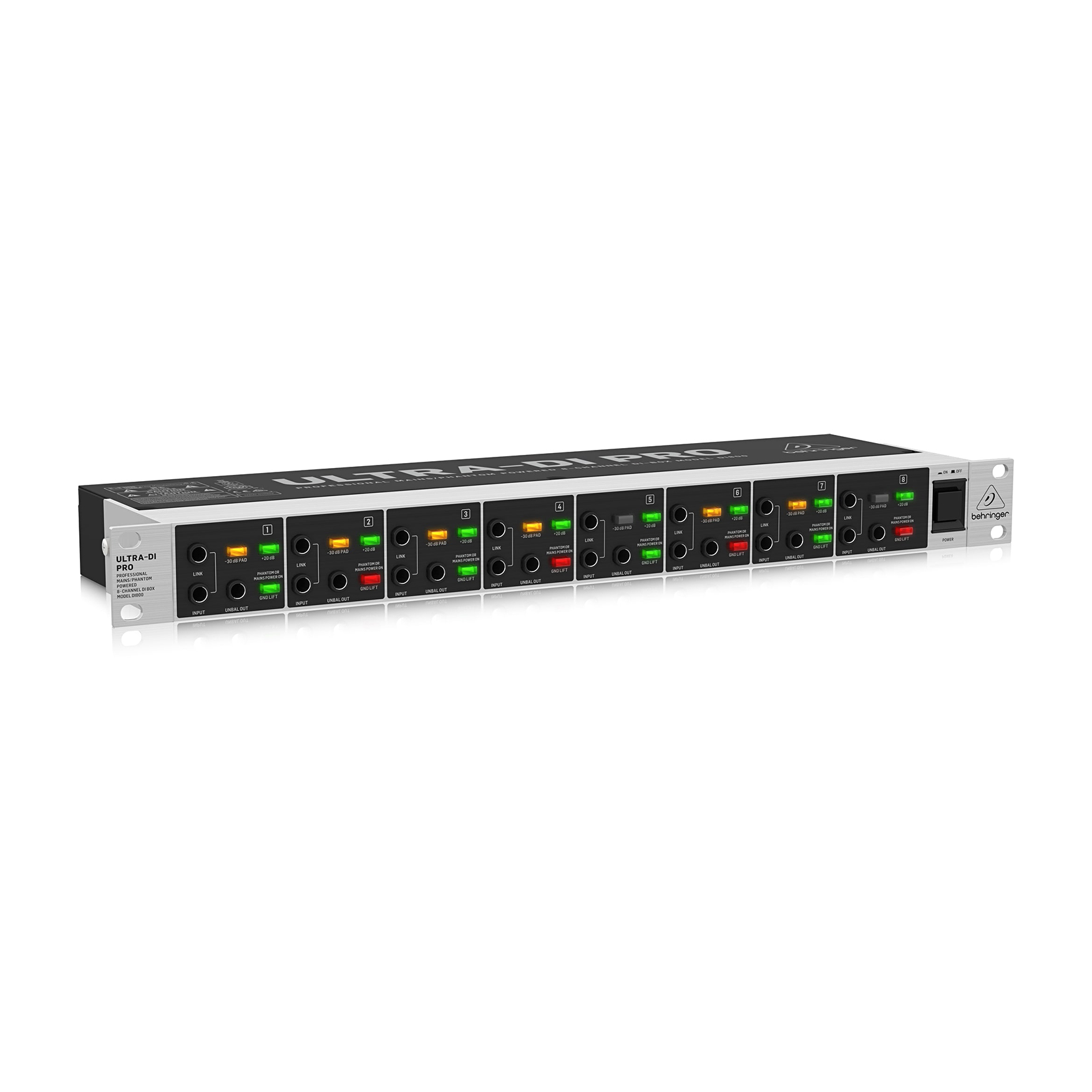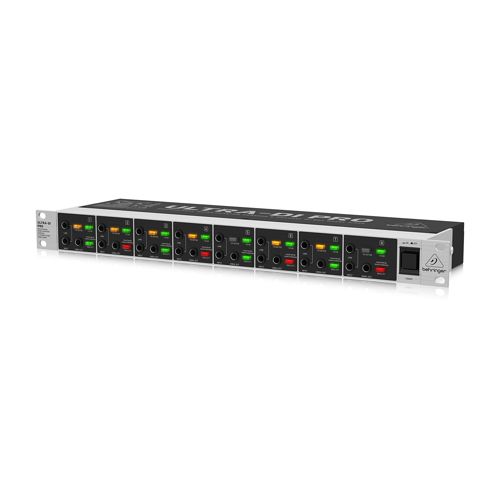 Behringer ULTRA-DI PRO DI800 V2 – profesjonalny, wielofunkcyjny, 8-kanałowy, aktywny DI-box do zastosowań scenicznych i studyjnych. Zapewnia dopasowanie impedancji i poziomu sygnału przy bezpośrednim połączeniu instrumentów do mikserów i wzmacniaczy.