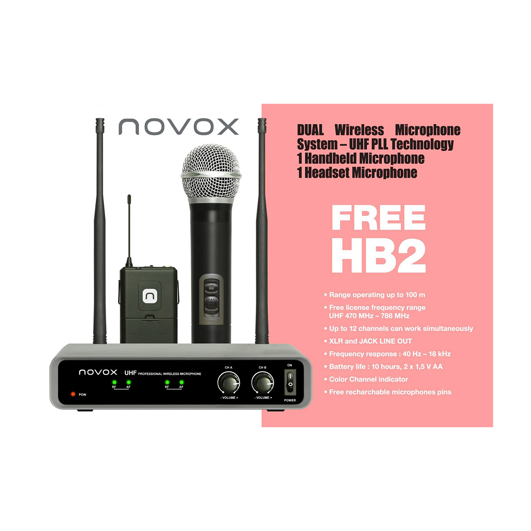 Zestaw bezprzewodowy z mikrofonem do ręki i nagłownym Novox FREE HB2. Bezprzewodowe systemy mikrofonowe z serii FREE są połączeniem najlepszego stosunku jakości do ceny, świetnego brzmienia oraz najwyższej jakości wykonania. Mikrofony i odbiorniki z serii FREE cechują się szerokim zakresem częstotliwości, dużym zasięgiem oraz solidną konstrukcją, która nie zawiedzie nawet w trudnych warunkach.