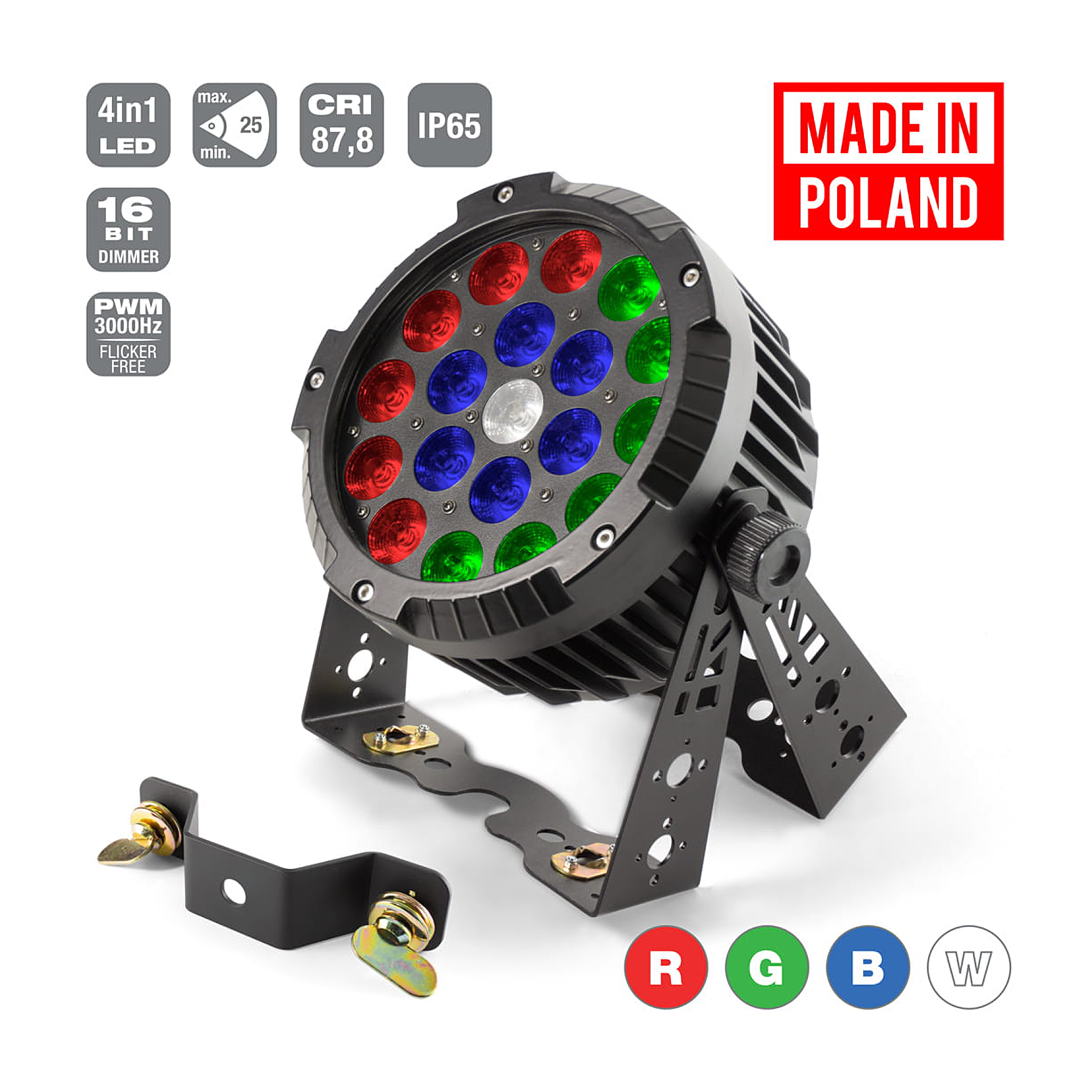 Profesjonalny reflektor LED PAR o 19 diodach 4w1 RGBW, odporny na warunki atmosferyczne (IP65). Doskonały do zastosowań scenicznych, estradowych i eventowych, zapewnia niezwykle płynną zmianę jasności oraz jednolitą barwę w całej instalacji.