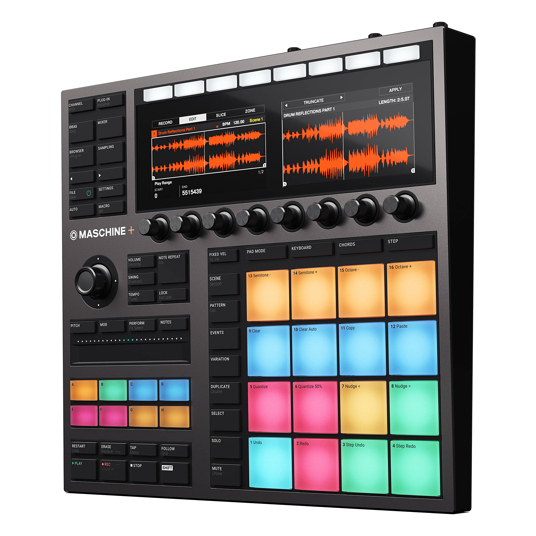 MASCHINE+, oprócz klasycznego workflow znanego z innych grooveboxów, zawiera MASCHINE+ Selection: pakiet dziewięciu potężnych syntezatorów i instrumentów samplowanych, 35 wysokiej jakości efektów oraz siedem rozszerzeń (w tym dwa wybierane samodzielnie).