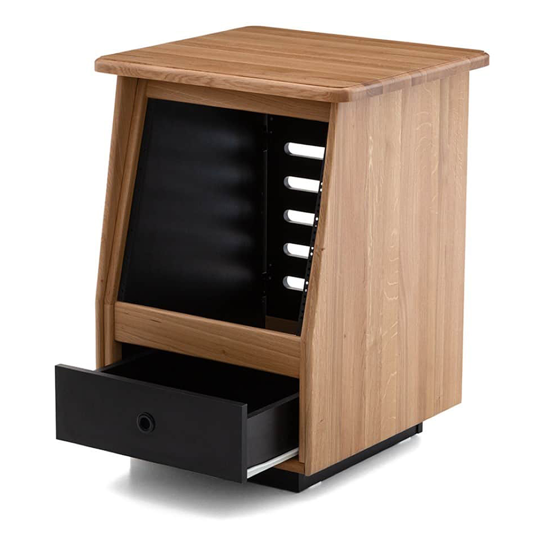 Profesjonalny rack studyjny wykonany z wysokiej jakości sklejki brzozowej i litego drewna (jesion). Dostępny w różnych wersjach, od pojedynczego stojaka z 10 miejscami na stojaki i szufladą do 5 jednostek, w tym wersji kątowej. Panele boczne z litego drewna naprawdę dają poczucie wysokiej jakości i trwałości. Dolna przestrzeń stojaków jest zwykle przeznaczona na rzadziej używany sprzęt, ponieważ trzeba się trochę schylić, więc wykorzystaliśmy ją raczej na praktyczną szufladę.Zaor RackSpace 1