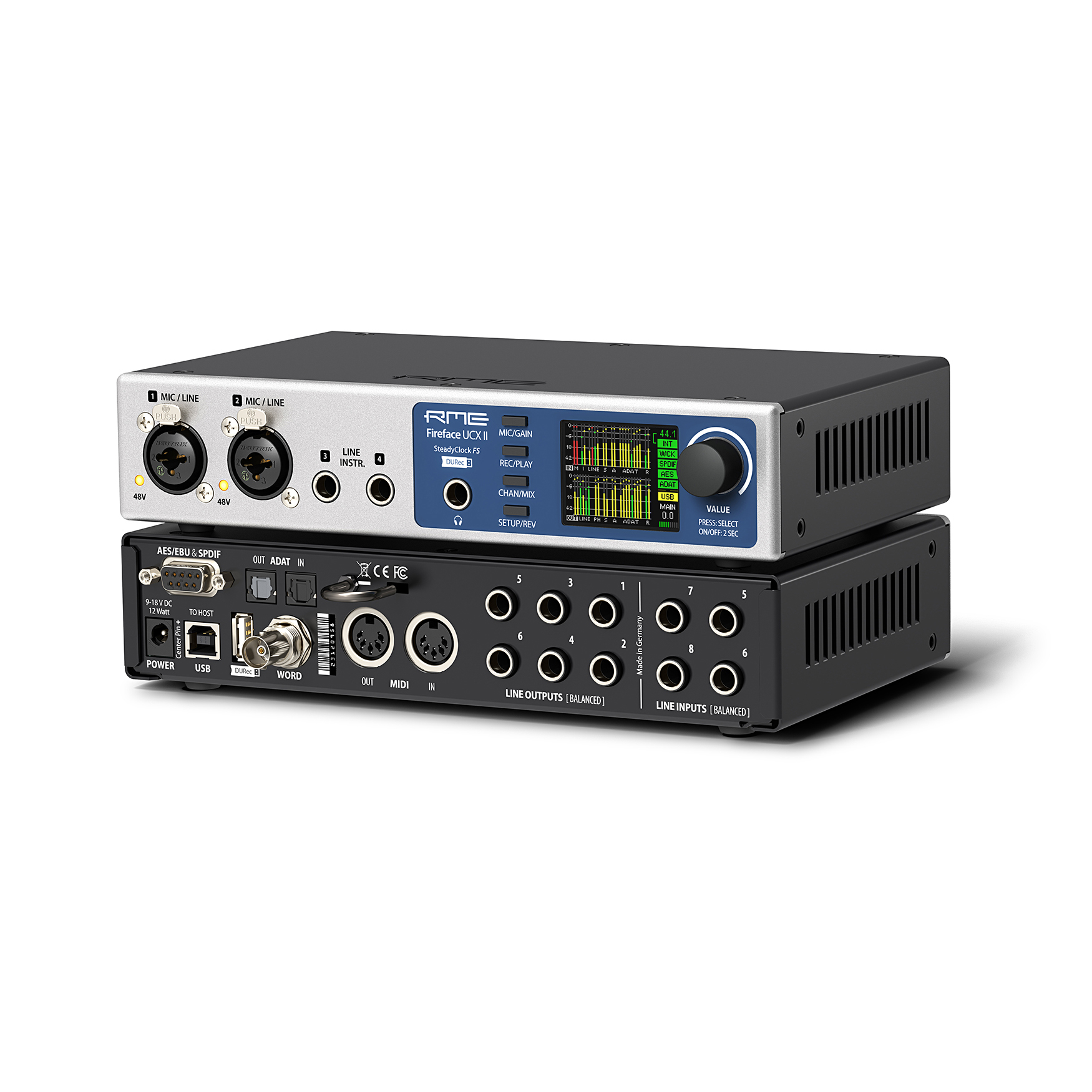 Ten unikalny system audio jest w stanie przesyłać analogowe i cyfrowe dane audio bezpośrednio do komputerów Windows i Mac. Najnowsza technologia Plug and Play gwarantuje prostą instalację, nawet dla niedoświadczonego użytkownika. Liczne unikalne funkcje, takie jak dobrze przemyślane okno dialogowe ustawień oraz zintegrowane rozwiązanie routingu realizują szybką, wygodną i wydajną obsługę Fireface UCX II.Fireface UCX II posiada dwa przedwzmacniacze mikrofonowo-liniowe w konfiguracji combo XLR na panelu przednim, wraz z dwoma cyfrowo sterowanymi wejściami liniowymi/instrumentalnymi, a następnie gniazdo słuchawkowe, różne przyciski sterujące, wyświetlacz oraz główne pokrętło głośności. Z tyłu znajduje się zestaw dziesięciu analogowych zbalansowanych wejść i wyjść liniowych, MIDI I/O, ADAT I/O, AES/EBU i SPDIF I/O, USB 2.0, jak również przełączalne wejście/wyjście word clock.Dzięki SteadyClock FS, Fireface UCX II posiada najnowszą technologię zegara i redukcji jittera od RME. Oparty na zegarze femtosekundowym, SteadyClock FS redukuje zniekształcenia jitter podczas konwersji z i do formatu analogowego na wszystkie formaty cyfrowe do nowego, najniższego poziomu.Pełna funkcjonalność w trybie autonomicznym