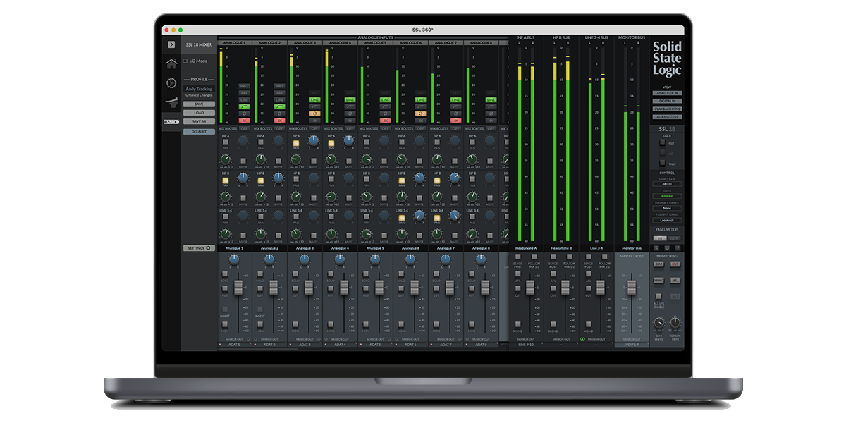 Mikser SSL 18 oferuje kompleksowe zarządzanie wszystkimi wejściami i wyjściami, a także szczegółowy, skalowalny pomiar wejść w SSL 360°. W mikserze SSL 18 można tworzyć i zarządzać miksem monitorowym w pomieszczeniu kontrolnym, a także skonfigurować do czterech niezależnych miksów dla wykonawców. Ponadto elastyczny system Mirror Routing pozwala na kierowanie dowolnego wejścia lub aux master bezpośrednio do wyjścia - idealne do zasilania osobistych systemów monitorowania, zewnętrznych pomiarów i zewnętrznych FX. Twórz różne szablony do śledzenia, miksowania i nie tylko, a następnie zapisz je jako profil w mikserze SSL 18.