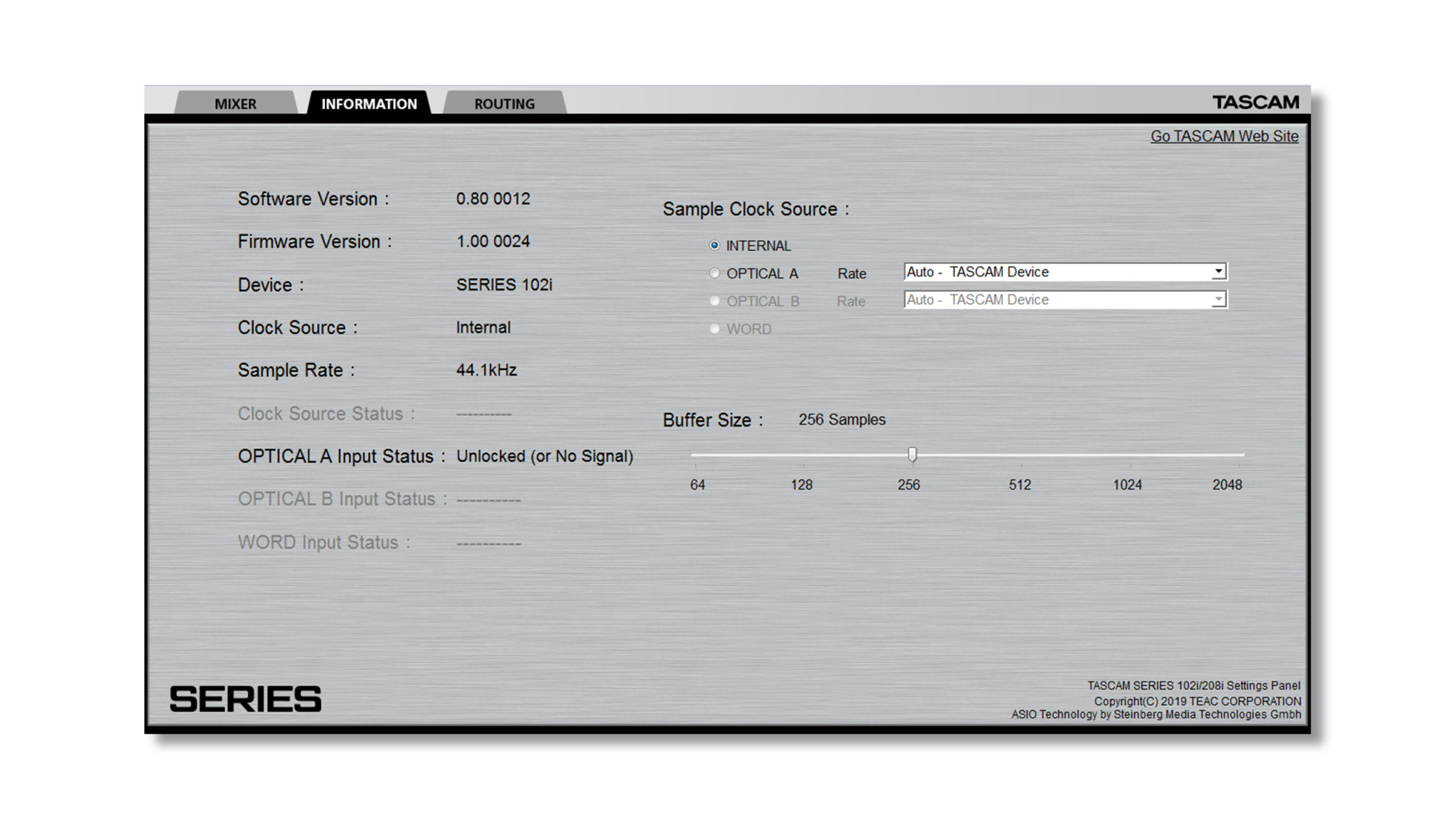 Tascam Series 102i – interfejs audio USB z dwoma wejściami combo XLR/TRS, wysoką rozdzielczością nagrywania 24 bity/192 kHz, podwójnym gniazdem słuchawkowym, wbudowanymi efektami, DSP oraz dedykowanym oprogramowaniem. Ponadto Series 102i posiada możliwość rozszerzenia wejść dzięki optycznemu portowi S/MUX.