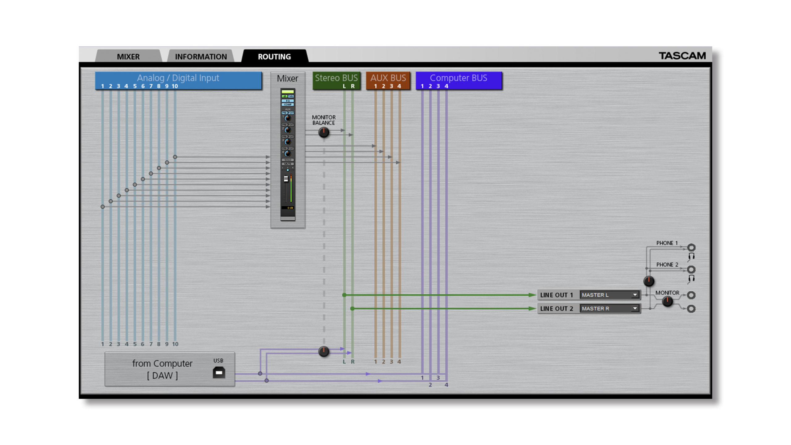 - Elastyczny mikser wejściowy/wyjściowy DSP sterowany przez darmowe oprogramowanie TASCAM Control