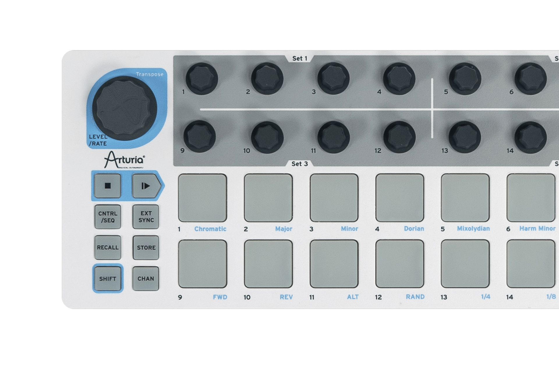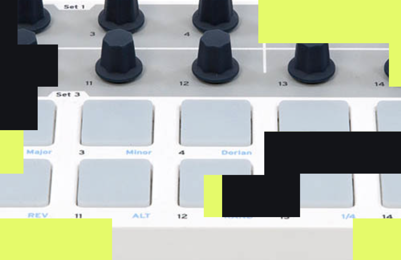 W trybie SEQ pady stają się przełącznikami dla każdego kroku w sekwencji. 16 enkoderów obrotowych wyreguluje rozdzielczość dla powiązanego kroku.
