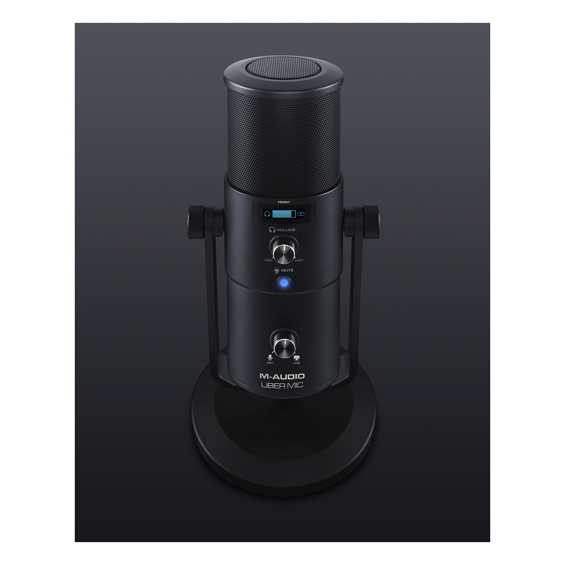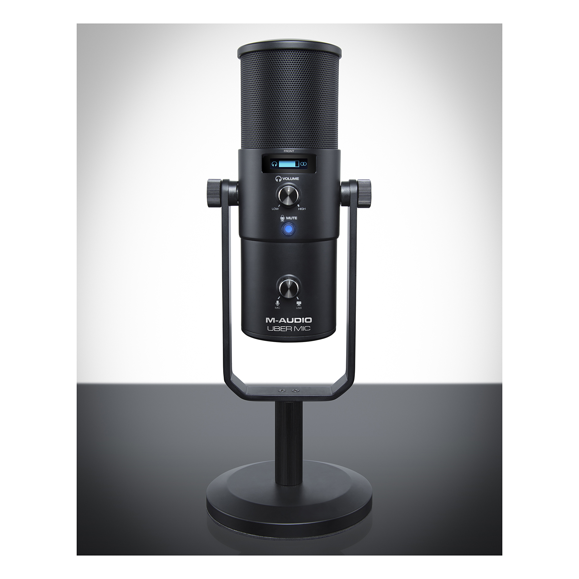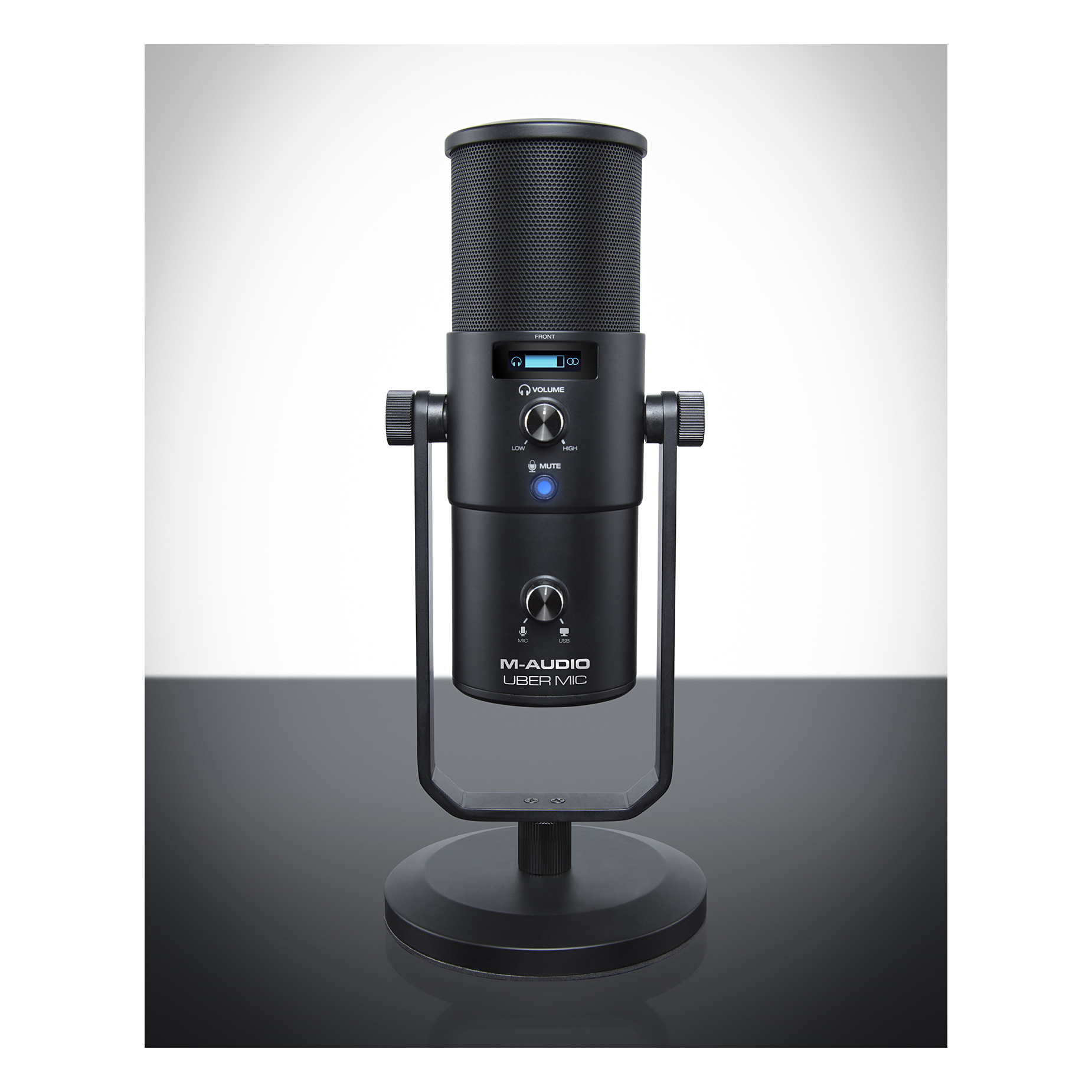 M-Audio Uber Mic – 3-kapsułowy mikrofon pojemnościowy USB, kompatybilny z Mac, PC i iOS. Uber Mic posiada przetwornik 16-bitowy/48kHz oraz wiele funkcji, które użytkownik może dowolnie regulować w tym: 4 charakterystyki kierunkowości, wyjście słuchawkowe z regulacją głośności, przycisk mute, regulacja poziomu wybranego kontrolera oraz wyświetlacz LED.