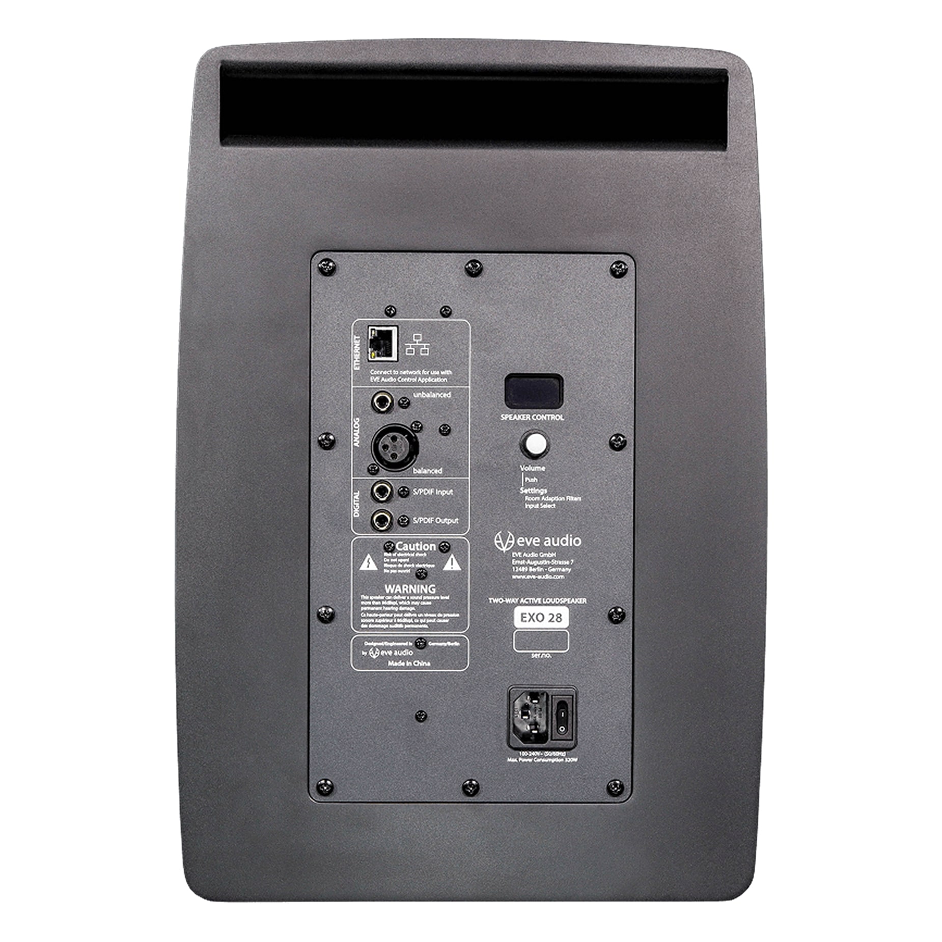 Zamontowany z tyłu wyświetlacz OLED w połączeniu ze zintegrowanym pokrętłem SMART Control Knob umożliwia bardzo intuicyjną i przyjazną dla użytkownika obsługę.Wszystkie krytyczne parametry systemu są wyraźnie prezentowane na wyświetlaczu, podczas gdy enkoder umożliwia precyzyjną regulację kluczowych ustawień, takich jak poziom wyjściowy, filtry adaptacyjne pomieszczenia i wybór źródła wejściowego. EXO 28 zapewnia łatwy dostęp do oprogramowania sterującego, precyzyjnej kalibracji i przyszłych aktualizacji oprogramowania układowego, umożliwiając regulację w czasie rzeczywistym bezpośrednio na monitorze bez przerywania procesu twórczego..Podświetlane logo „eve audio” na przednim panelu pełni funkcję wielokolorowego wskaźnika statusu. Zapewnia ono feedback w czasie rzeczywistym na temat warunków pracy, w tym ochrony przed przeciążeniem, postępu aktualizacji oprogramowania układowego i różnych stanów systemu. Podczas normalnej pracy logo emituje ciepłą białą poświatę, wskazując, że system działa optymalnie i jest gotowy do odtwarzania dźwięku o wysokiej wierności lub krytycznych zadań monitorowania. Jasność logo można dostosować do otoczenia lub gustu użytkownika.
