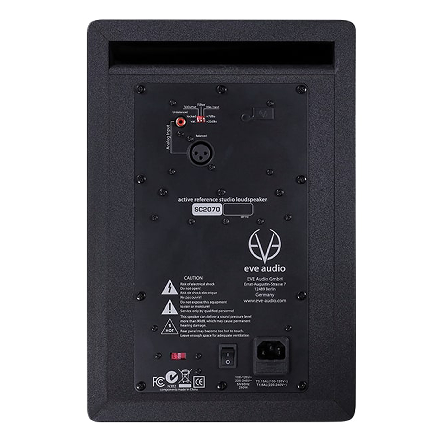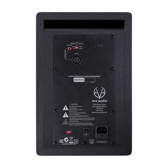 Skierowany do tyłu port bass reflex jest, jak zwykle w przypadku EVE Audio, zaprojektowany pod kątem niskiego poziomu szumów przepływu powietrza i wzmacnia potężną i precyzyjną reprodukcję basu.Specyfikacja techniczna EVE Audio SC2070