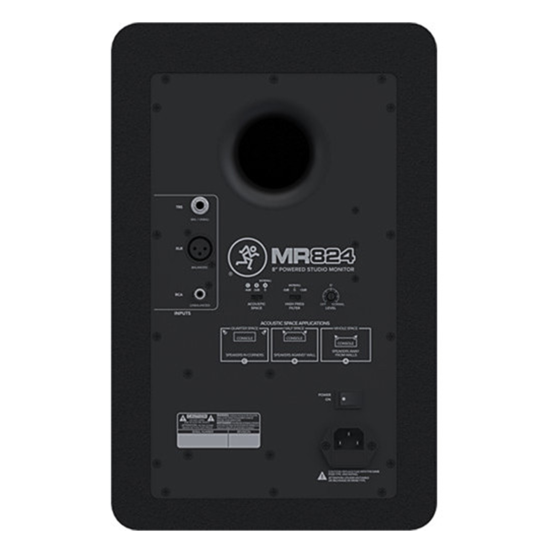 Mackie MR824 – największy w serii aktywny monitor studyjny o mocy 85 W. Mackie MR824 posiada duży 8″ przetwornik niskotonowy co pozwoliło na rozszerzenie pasma przenoszenia aż do 35 Hz – 20 kHz. Dodatkowo monitor zaopatrzono w akustyczny filtr przestrzeni, dzięki czemu możemy dostosować głośnik do warunków w naszym pomieszczeniu odsłuchowym.