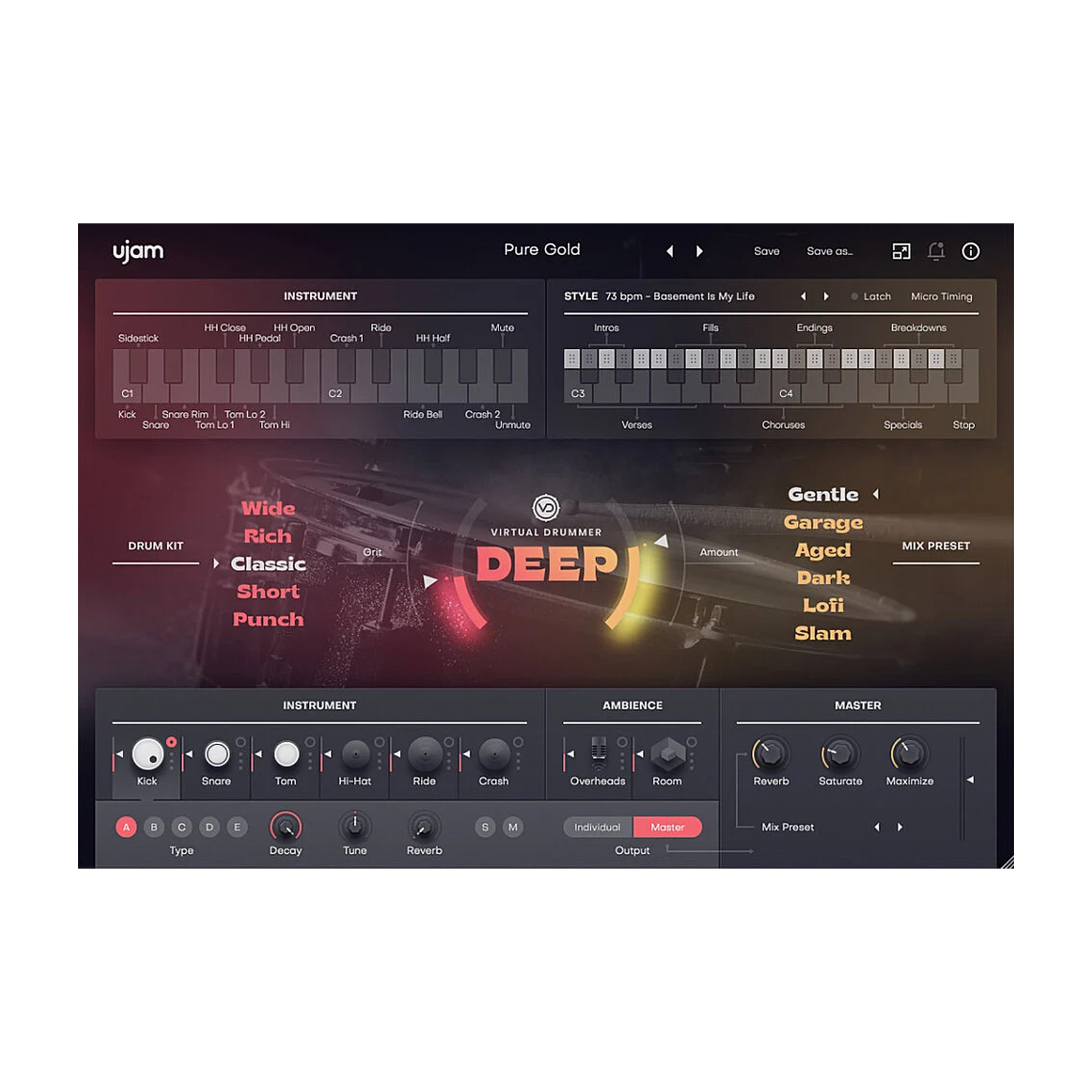 UJAM Virtual Drummer DEEP to wirtualny perkusista inspirowany soul i funkiem lat 60. i 70., z nowoczesnym podejściem i studyjną jakością nagrań. Jego groove’y są pełne emocji, głębi i autentyczności – idealne zarówno do klasycznych brzmień retro, jak i współczesnych produkcji popowych czy RnB.