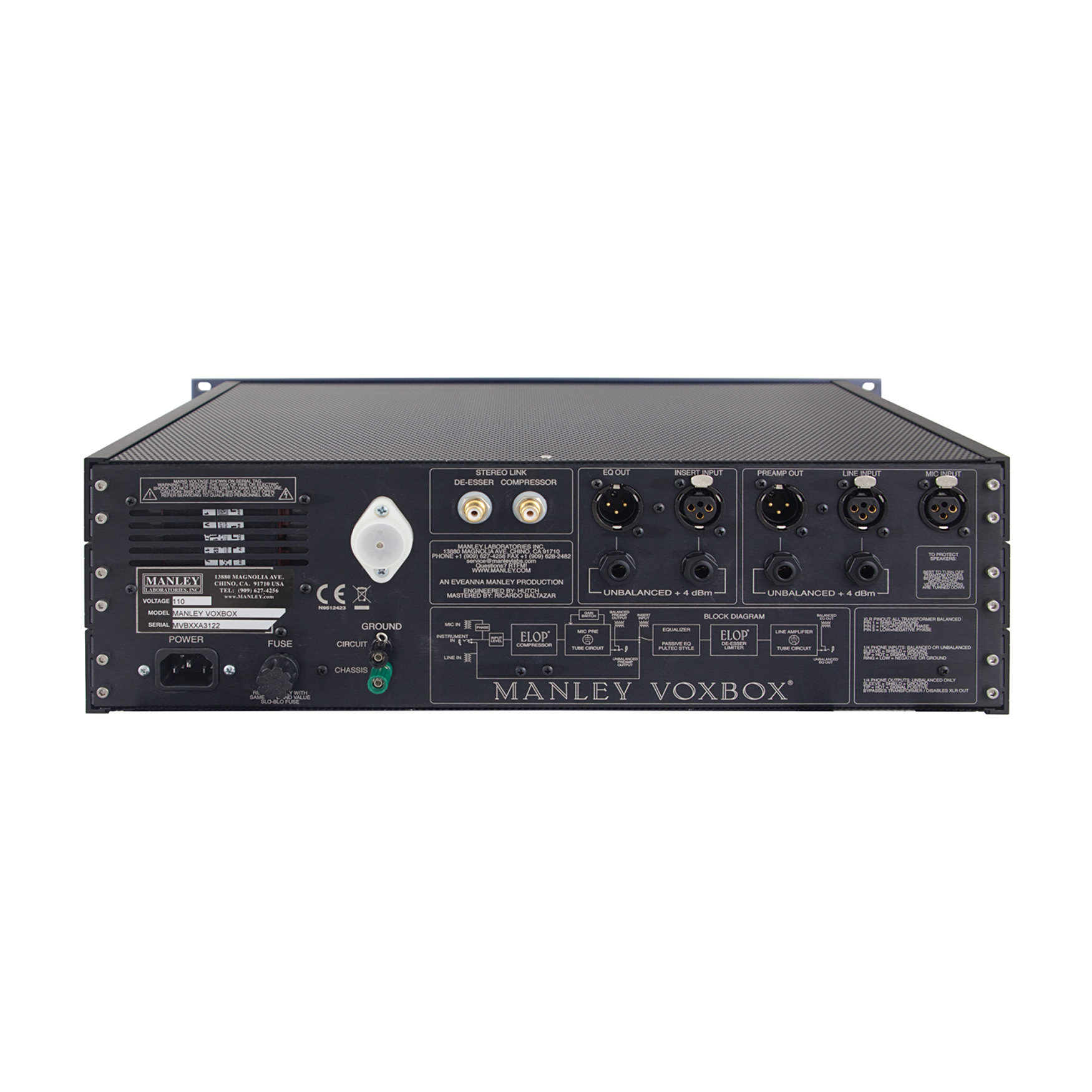 Manley Voxbox łączy w sobie legendarny monofoniczny preamp mikrofonowy Manley, kompresor Elop (w wersji o niższym ratio), pełnopasmowy korektor Peak-DIP-Peak EQ oraz De-Esser z dodatkowym limiterem Elop na końcu toru. Dzięki wejściu Direct często określany jest także mianem Bassboxa, bo znakomicie sprawdza się z gitarą basową.