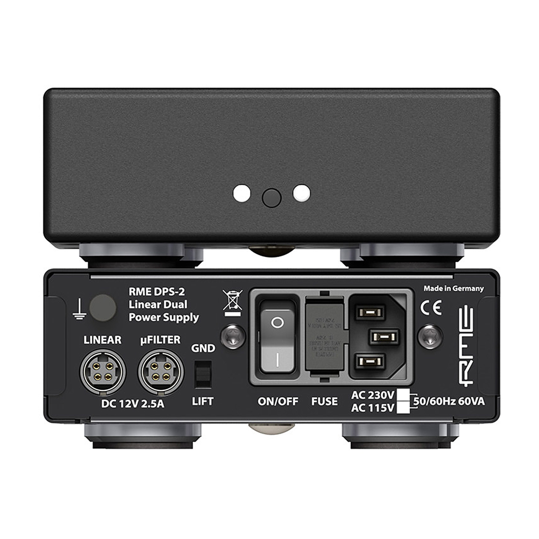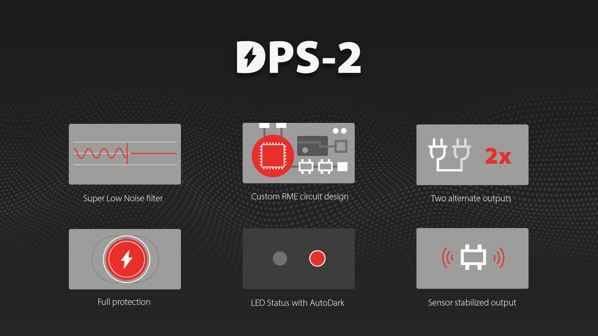 DPS-2 posiada dwie diody LED z przodu, które zapewniają szybki przegląd trybów pracy i błędów (zasilanie, przeciążenie termiczne i mocy, zbyt niskie napięcie, zwarcie, aktywne wyjście). Wbudowany przełącznik na panelu przednim włącza unikalny tryb AutoDark, w którym diody LED świecą się tylko w stanach błędu i krótko podczas włączania zasilania.Kolejną unikalną cechą jest 24-stronicowa instrukcja, która szczegółowo przedstawia dane techniczne przy użyciu wielu zmierzonych wartości, zilustrowanych wykresami pomiarowymi. Zawiera ona również podstawowe informacje na temat zasilaczy liniowych i impulsowych.Specyfikacja techniczna RME DPS-2